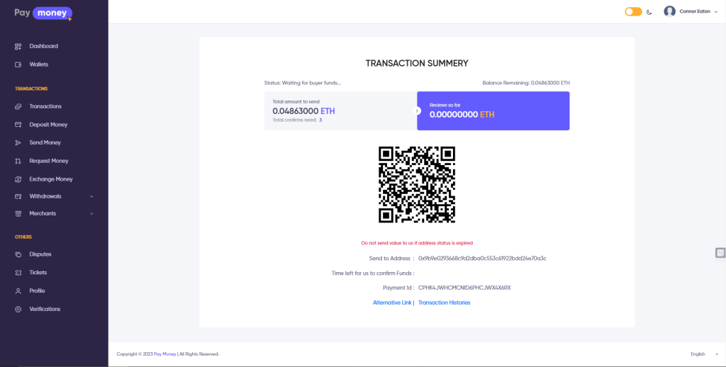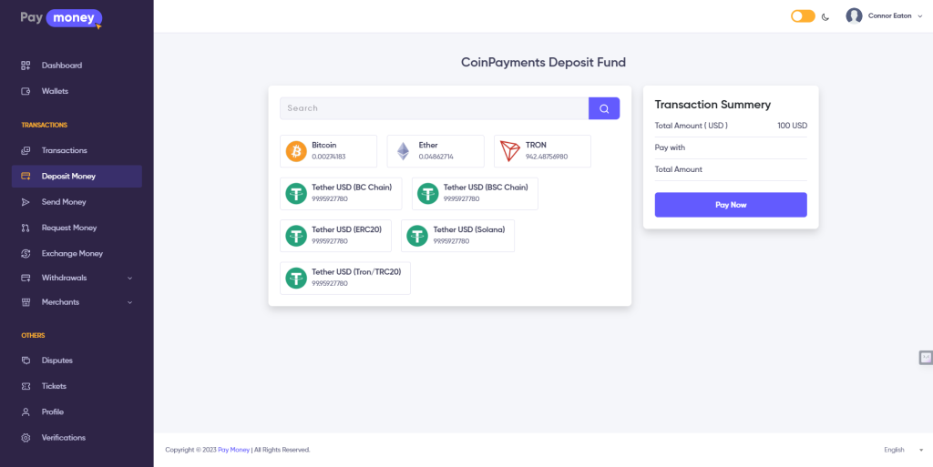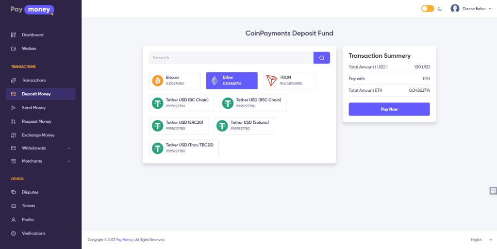 This user guide illustrates the seamless process of depositing funds via CoinPayments to the Admin CoinPayments account and subsequently receiving the equivalent digital figure in your desired currency wallet within PayMoney.