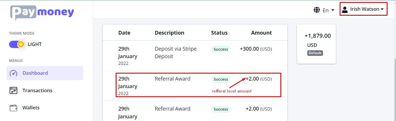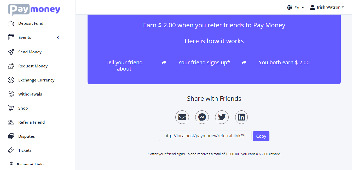 When a friend(in this case – kyla@gmail.com) registers using the referral link (which can shared via – Gmail, Facebook, Linkedin and Twitter) and deposits amount greater than or equal to minimum referral amount(in this case – 300), the referred by user(in this case – irish@gmail.com) will get awarded amount of first level(in this case – 4.1) among the referral levels (set by admin).