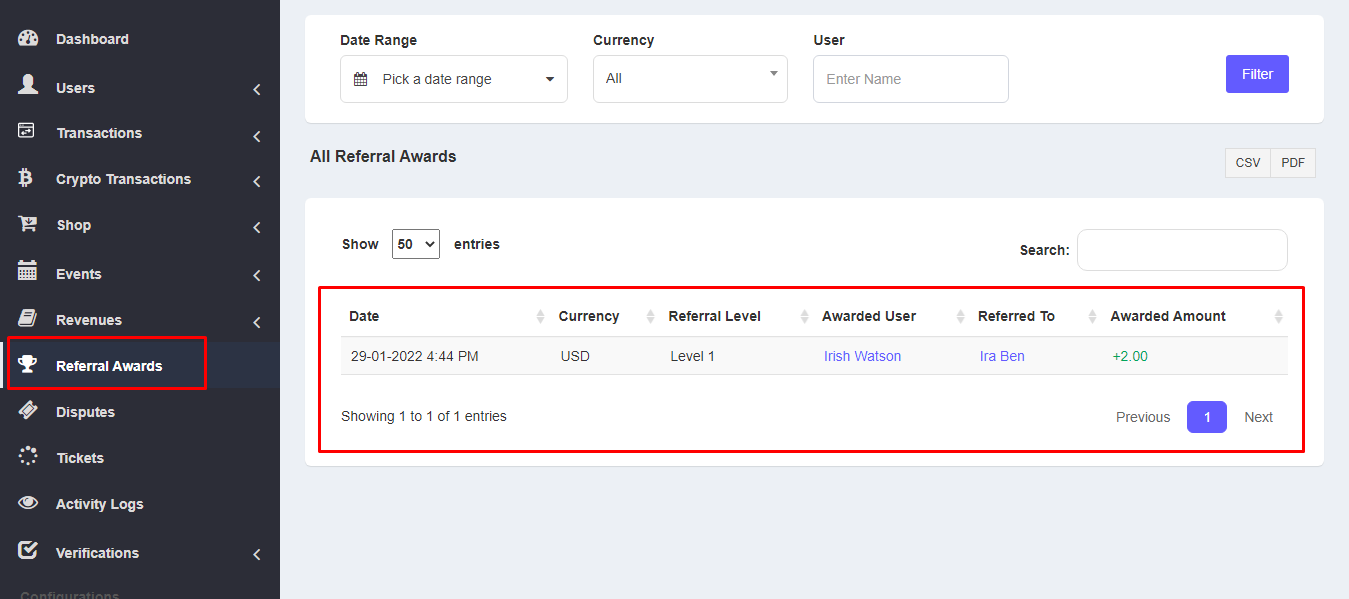 After users received referral awards, admin will be able to see-