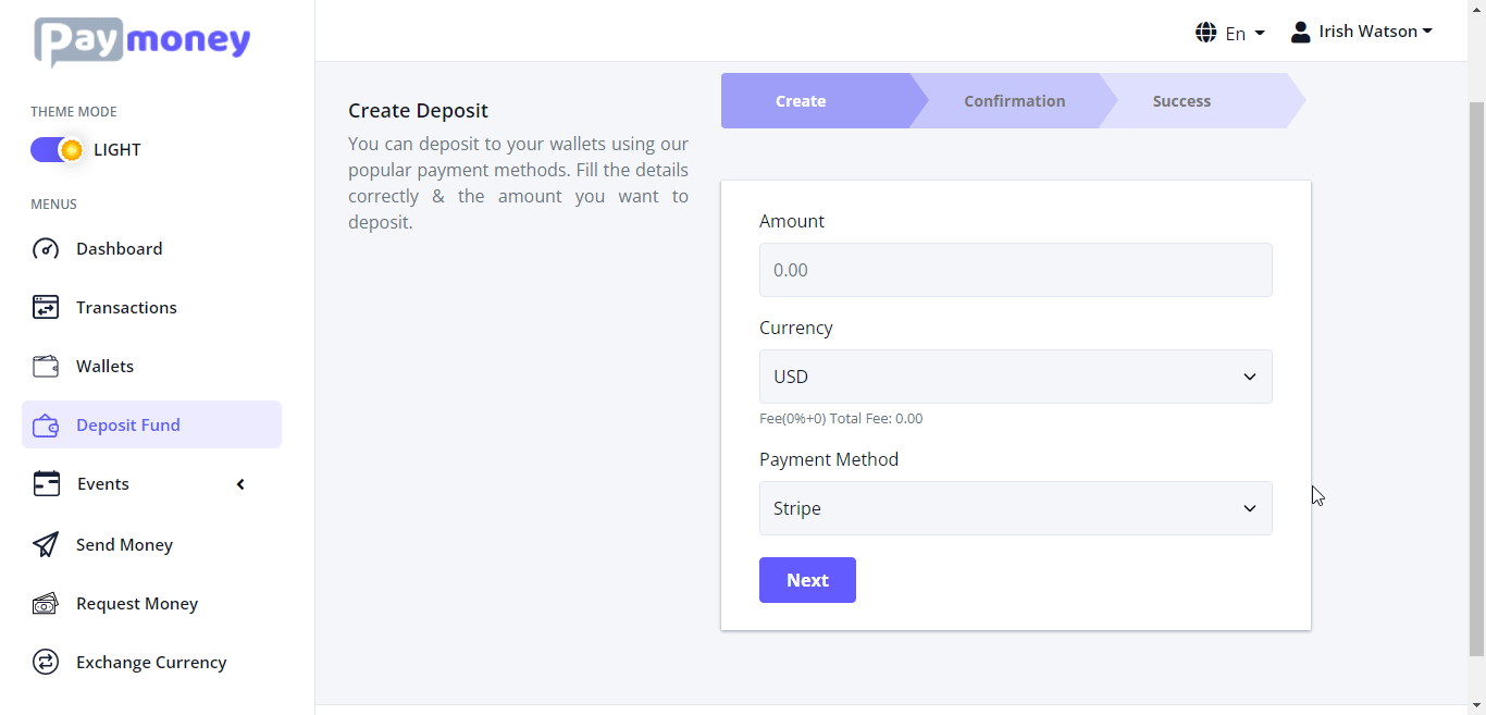 Currency (usd) – Level (test 1) – amount(4.5) – status(active)
