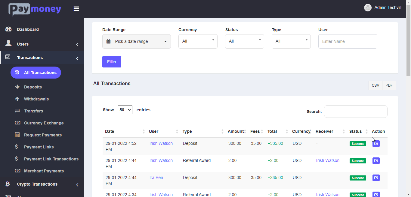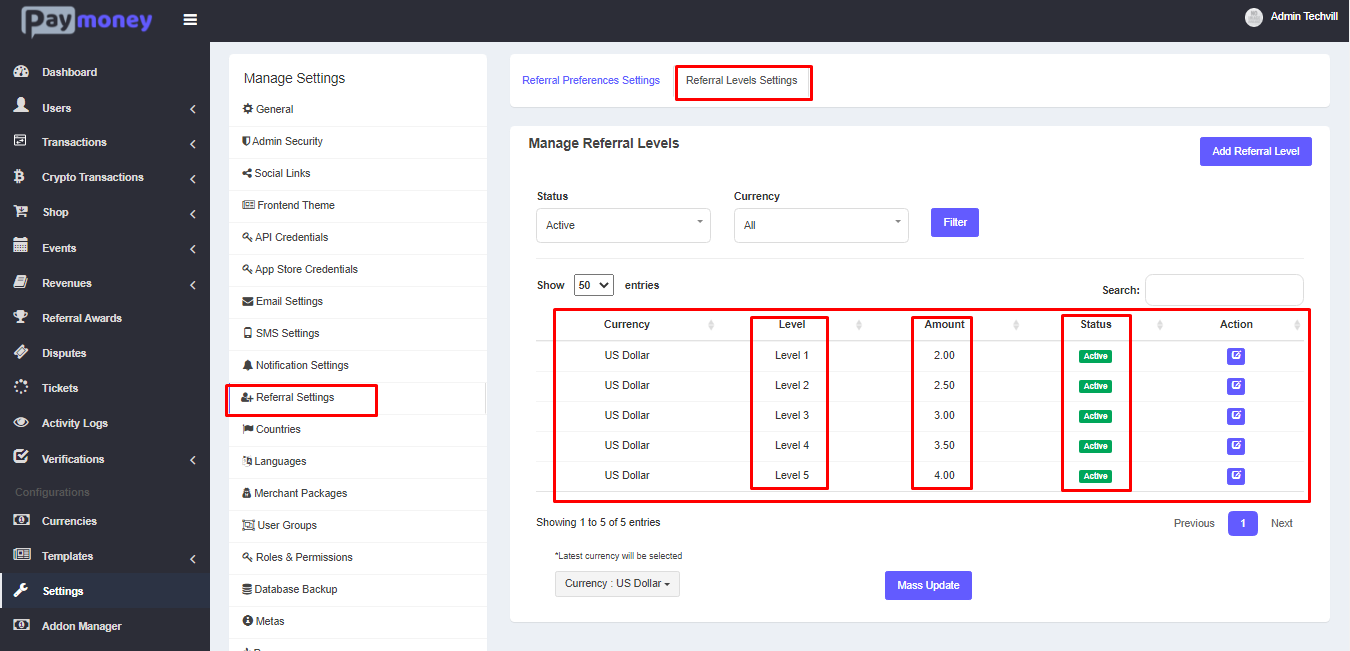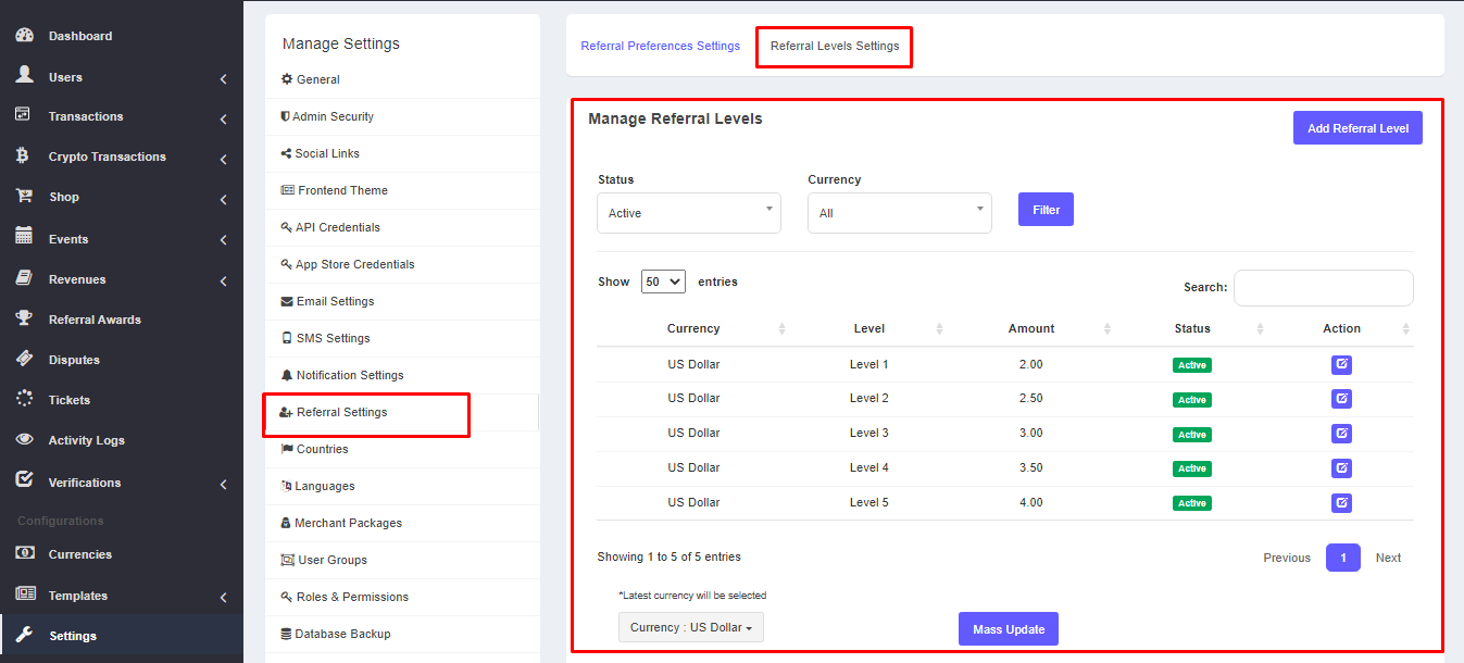 — Admin can filter referral levels by status and currency.