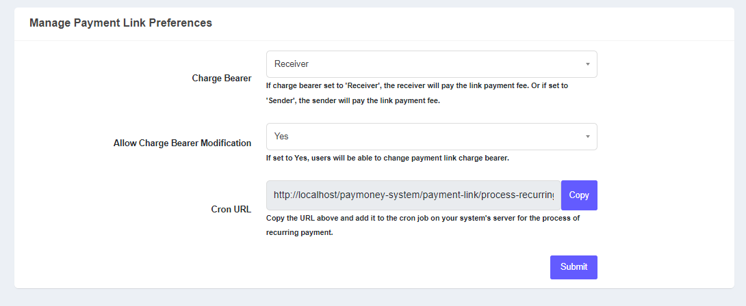 Cron URL: This section is for recurring payment.To set up recurring payment process, please click on the copy button to copy the corn url. Then add it to the cron job on your system's server to initiate recurring payment.