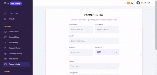 Charge Bearer: This field determines that, if the charge bearer is set to 'Receiver', the receiver will pay the link payment fee. Or if set to 'Sender', the sender will pay the link payment fee.
