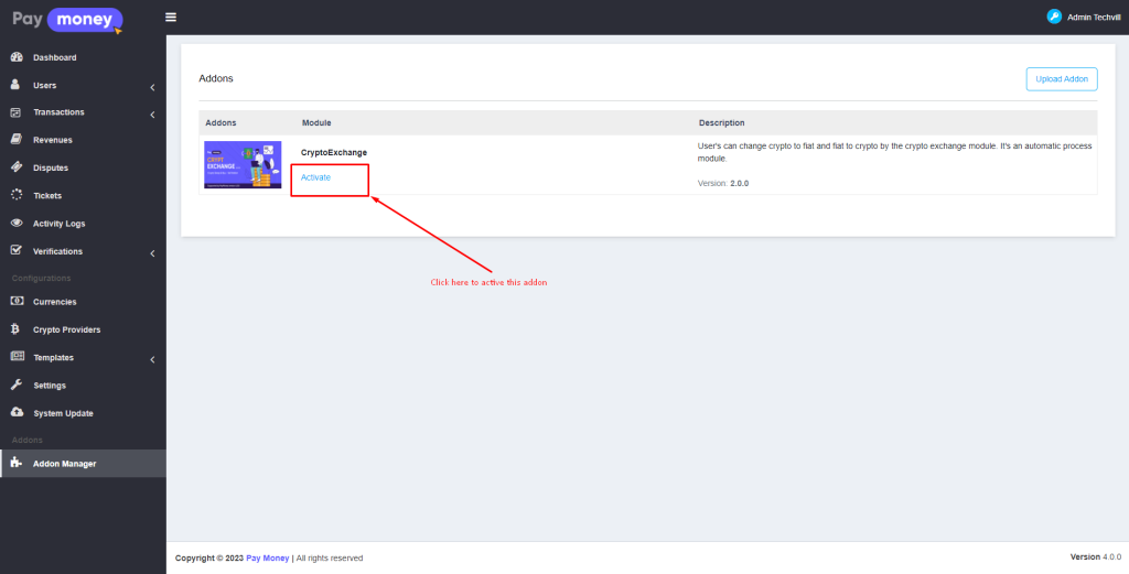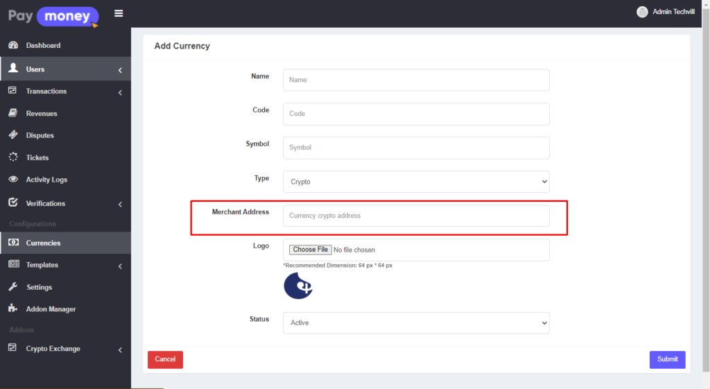 Setup currency: admin must set up cryptocurrency with his crypto address as a merchant address. This address will be visible to the user when the user has the option of sending crypto to the admin