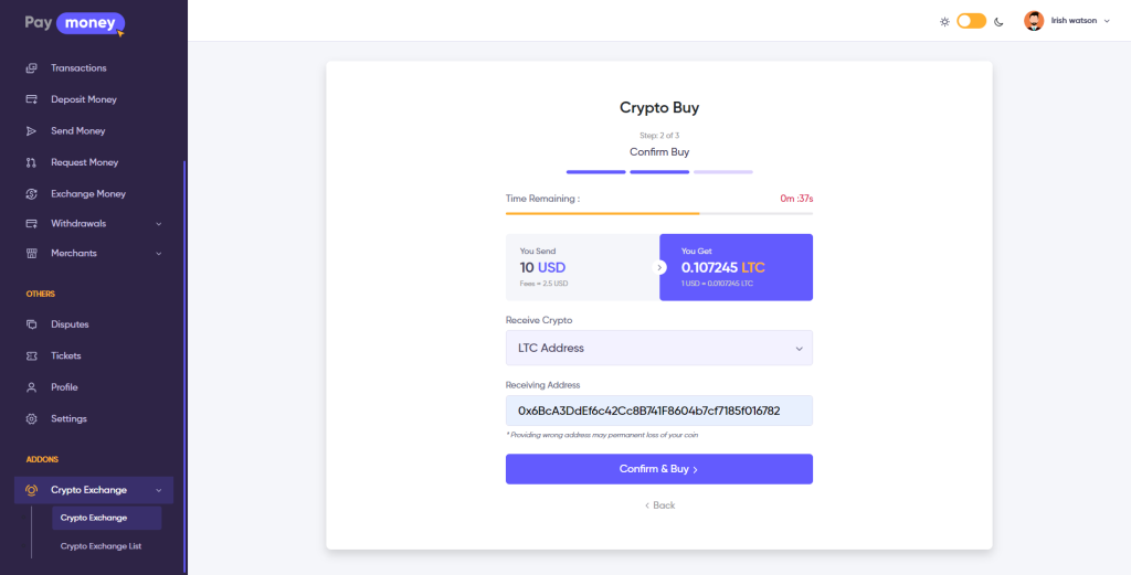 Users can buy cryptocurrency from the admin with a fiat balance, here fiat balance will deduct from the user’s wallet. The user can choose how they want to receive the crypto balance, user can choose to receive the option Address or Wallet.