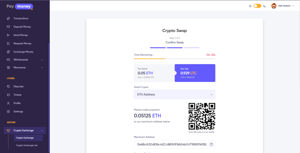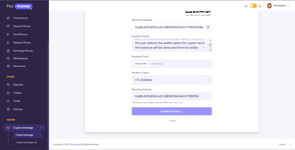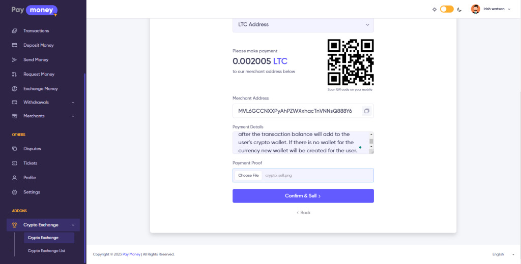 Users can sell their crypto to the admin for fiat currency, users can choose to send crypto option Address or Wallet. If the user selects send crypto option Address, a QrCode will show with the admin crypto address. The user will manually send the crypto balance to the merchant’s address & provide payment details with the attached file.