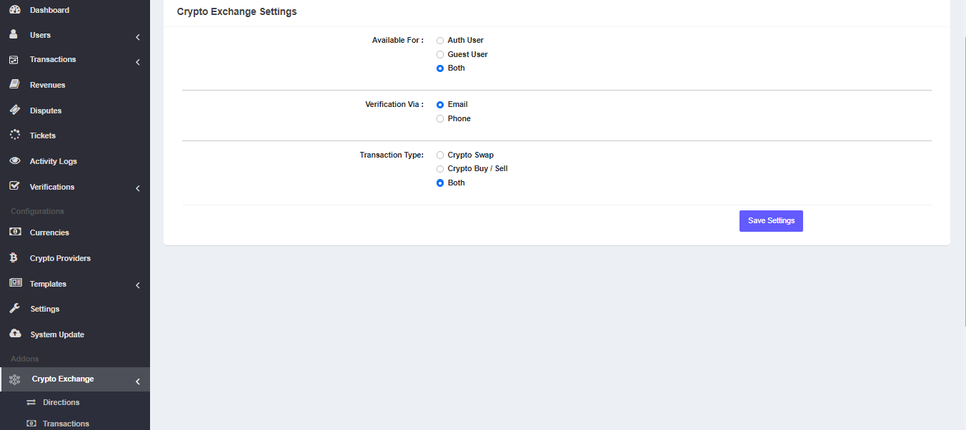 Transaction Type: The admin can choose which transaction type will be available on the feature, if Admin sets the Transaction type Crypto Swap, then Crypto Buy & Crypto Sell feature will be disabled. If the admin sets Crypto Buy / Sell, the Crypto Swap feature will be disabled. To get all three types of transaction admin have to set the transaction type.