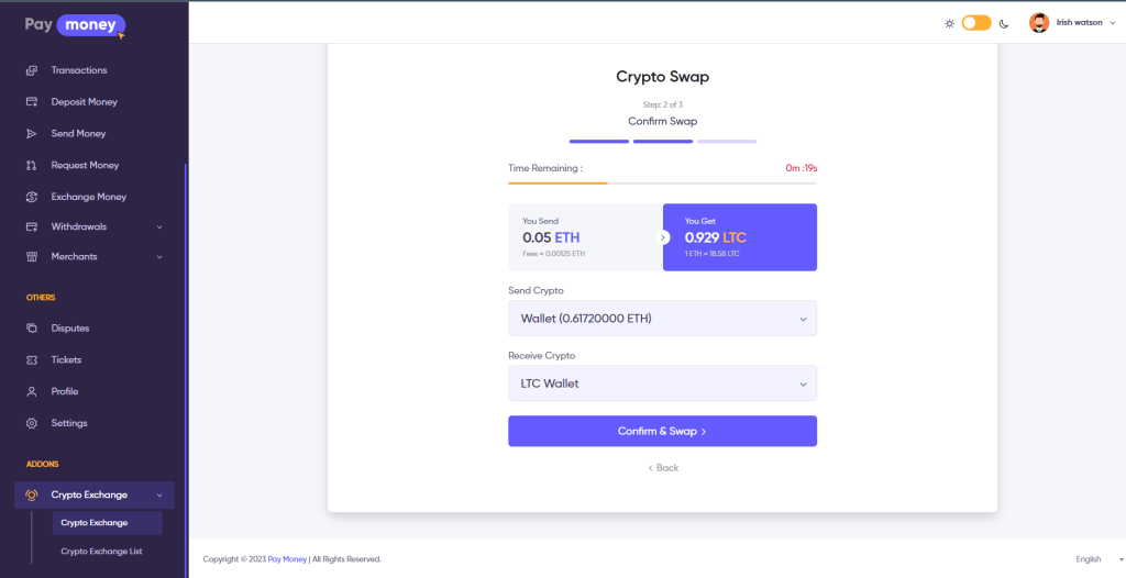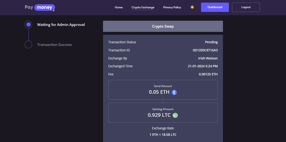 The user has to select the Crypto Swap tab, after selecting the currency pair & amount if the user submits the next button, the User will redirect to the confirmation page where the user has the option to send the crypto balance to the admin, and receiving option.