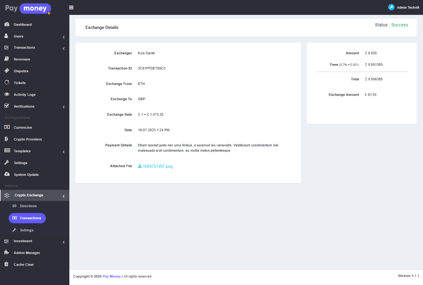 Payment: For sending the crypto balance to the admin, the user will get the crypto address of the admin, user has to send the crypto balance to the address manually & have to provide payment details with a payment proof file.