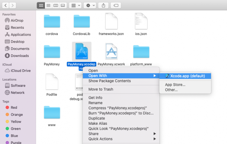 – Now right click on the Paymoney.xcodeproj and open with Xcode.app (default)
