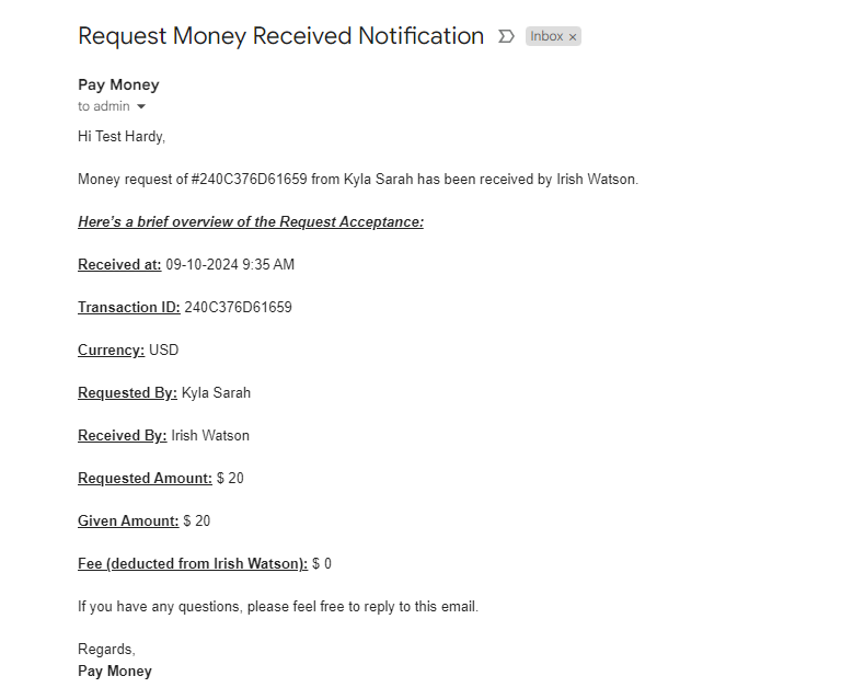 Upon accepting the request, request sender and admin will get notified about this transaction.