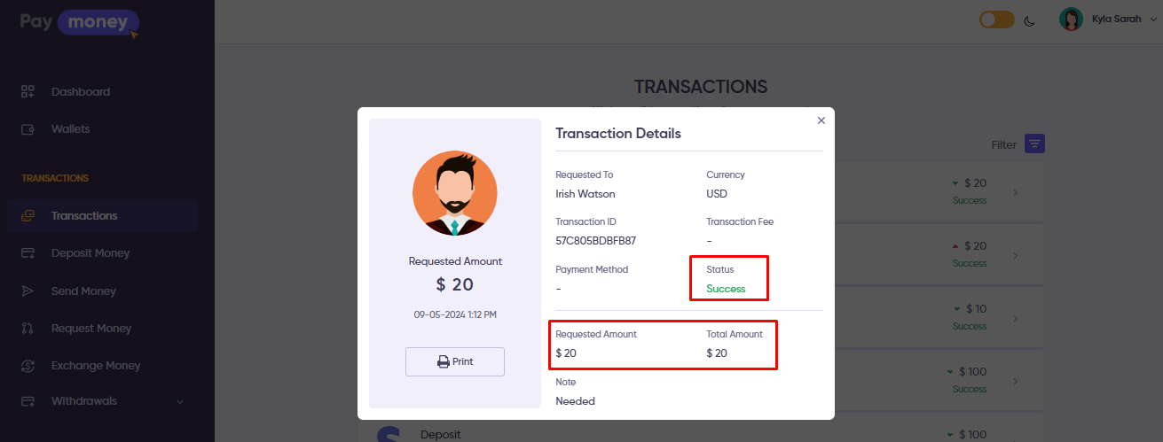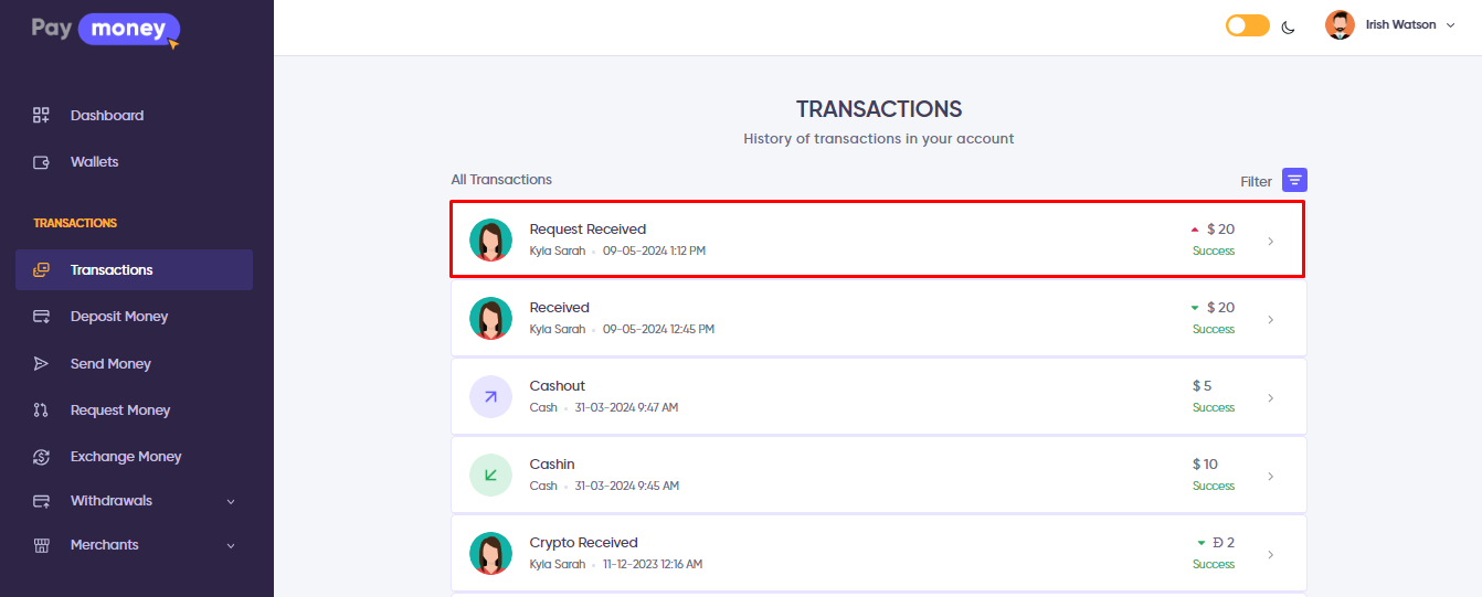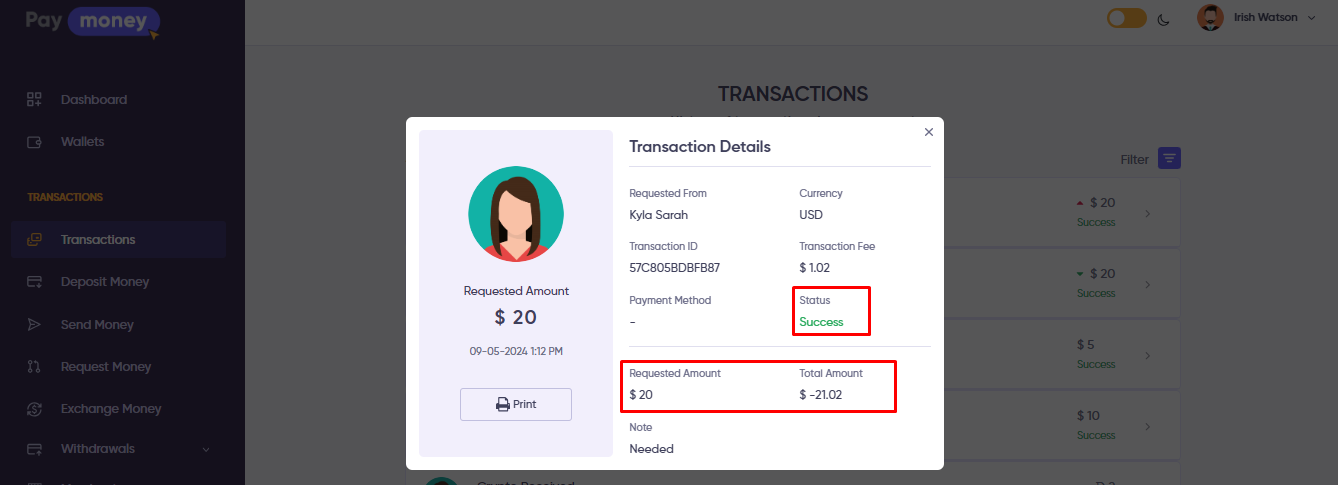- Upon accepting the request, the specified amount will be deducted from the acceptor’s wallet, inclusive of any applicable fees (These fees will be in accordance with the Fees & Limits as set in the admin panel).