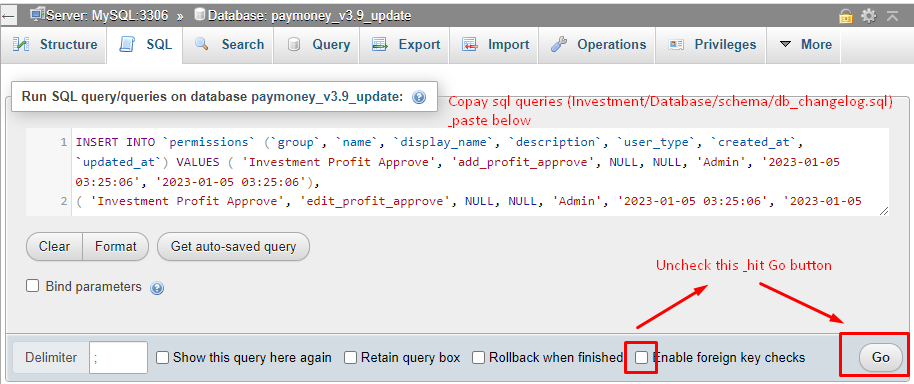 Click on the ‘Go’ button to execute the SQL queries and update the database.