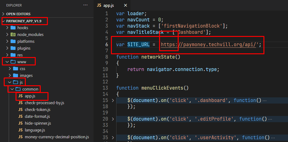 2) Go to “www/js/common/app.js” and replace SITE_URL with your installed Pay Money web application domain/sub-domain.