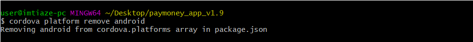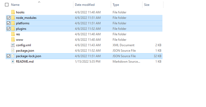 2) Delete the node_modules, platform, plugins folders and package-lock.json file.