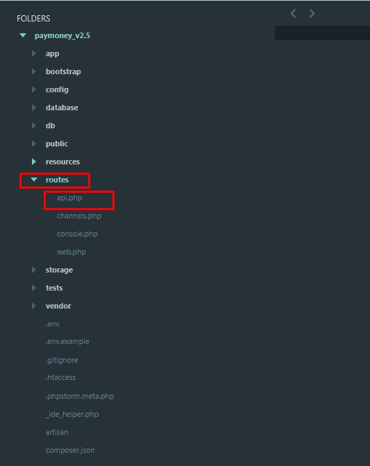 2) Go to “routes” folder and replace the file “api.php” with the “api.php” file from the latest Pay Money Web Application v2.5