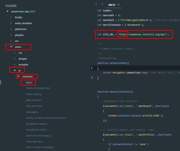 2) Go to “www/js/common/app.js” and replace SITE_URL with your installed Pay Money web application domain/sub-domain.