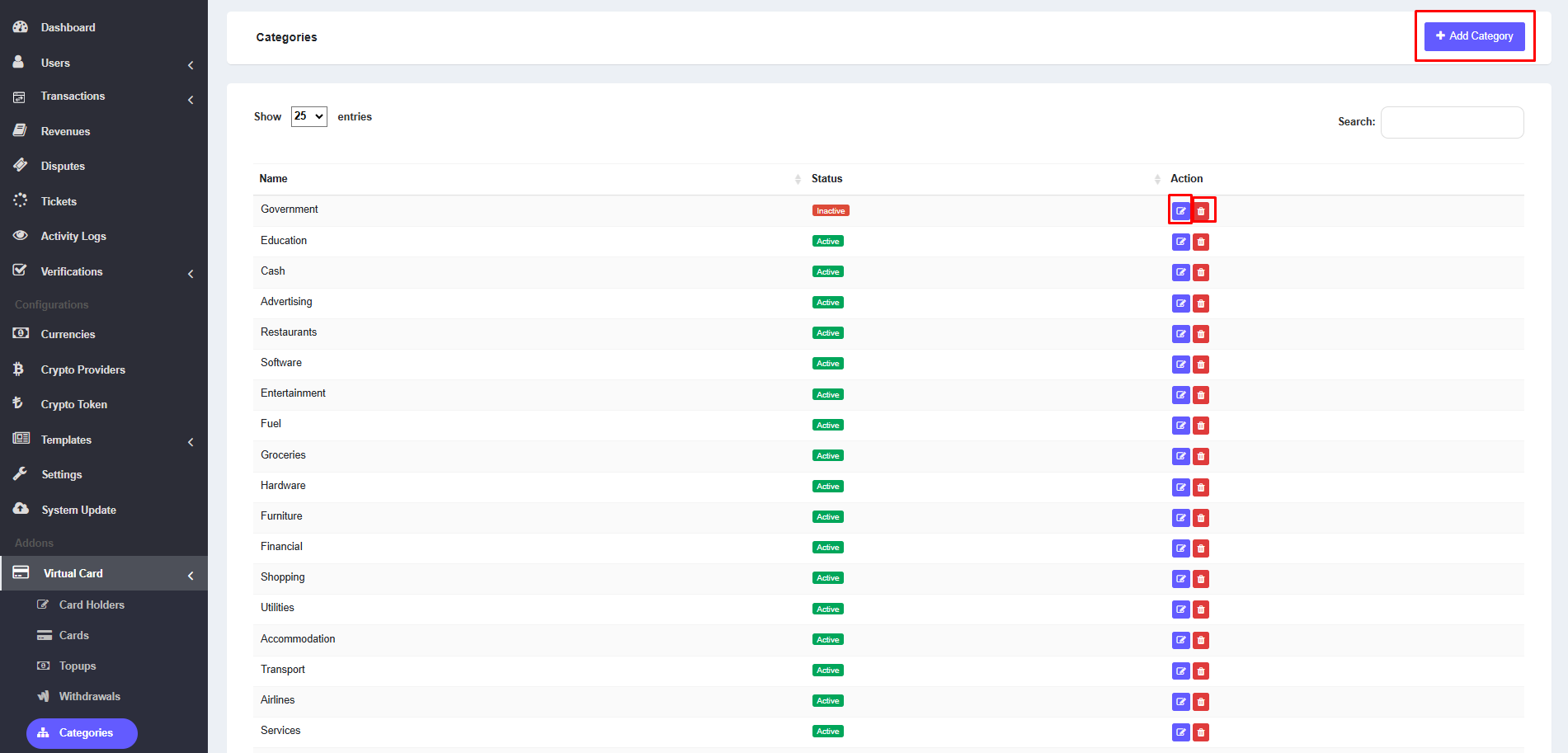 1. The admin can view the list of categories from the admin panel. To access the list, navigate to Virtual Card >> Categories. Here, the admin can see the list of all virtual card categories. Each row includes an edit icon and an delete icon. Click the edit icon to edit the specific category, or click the delete icon to delete a category.