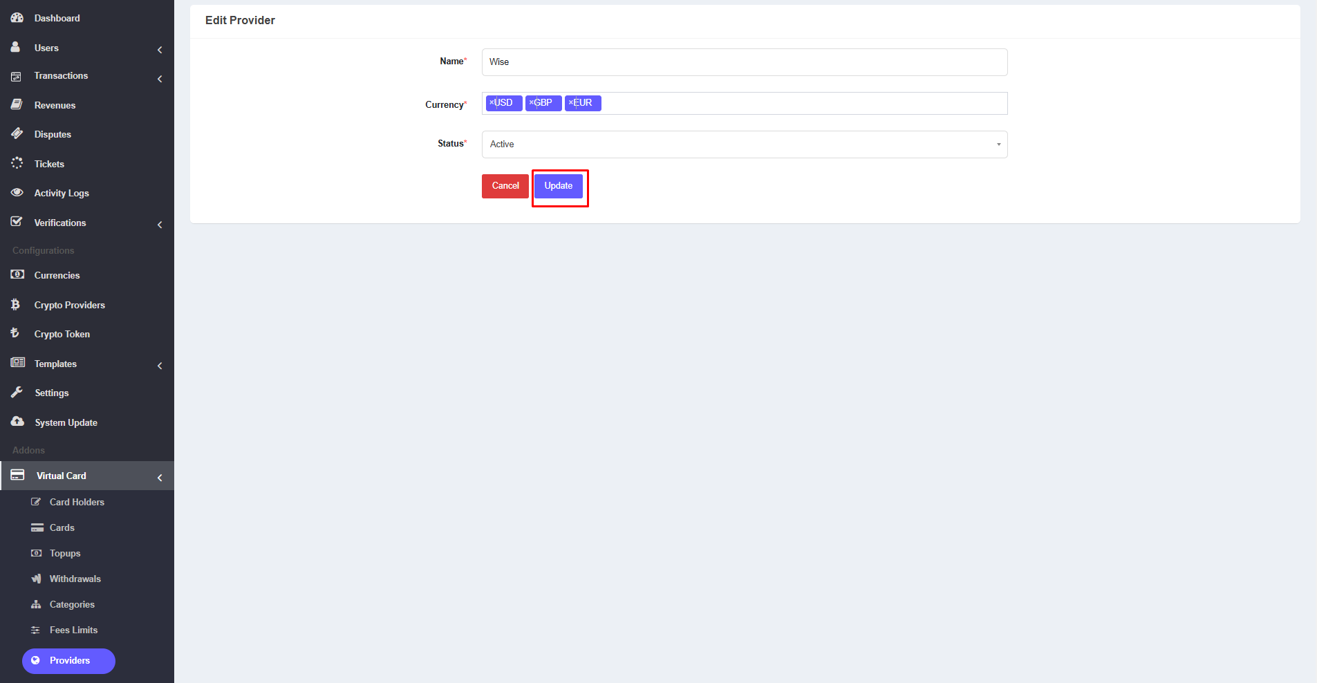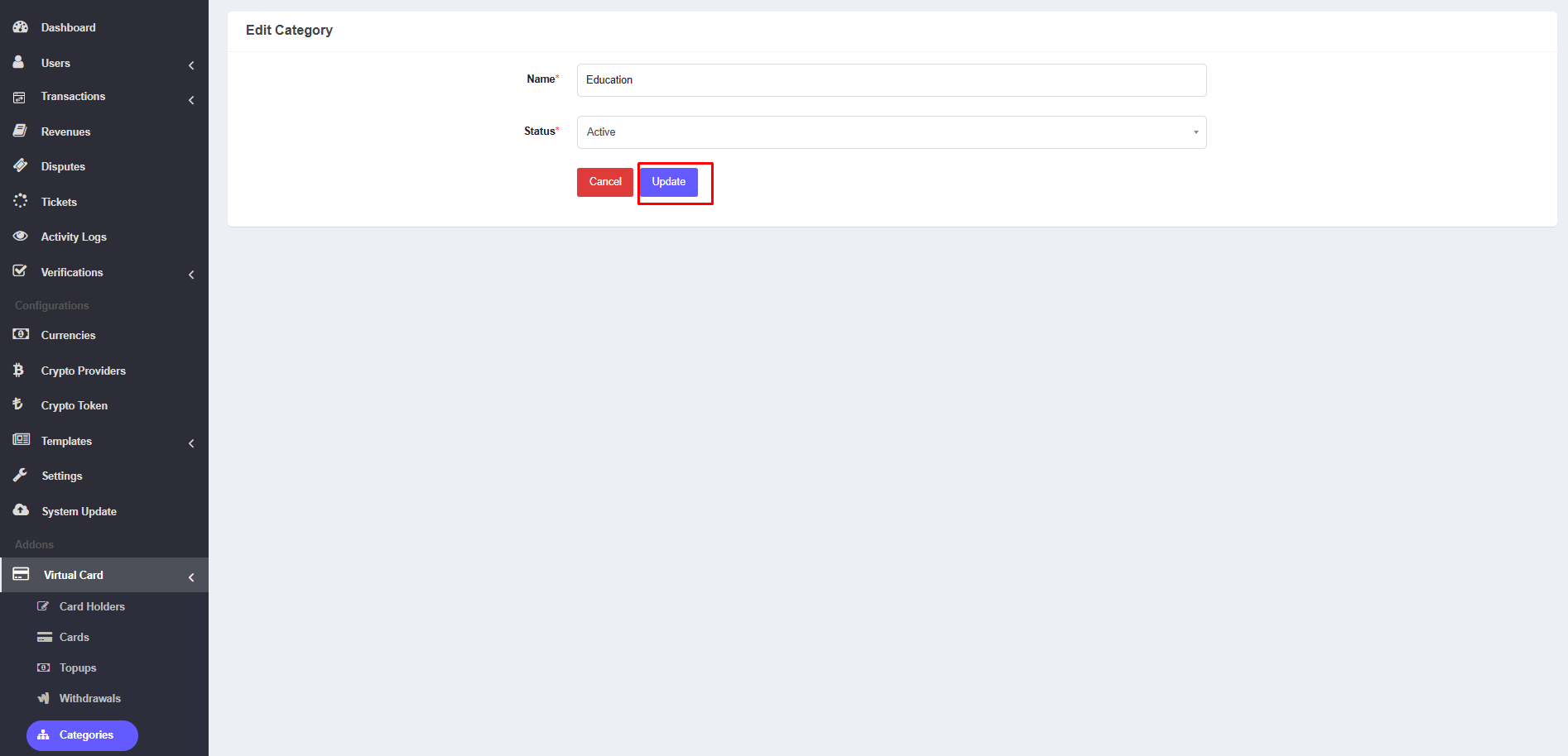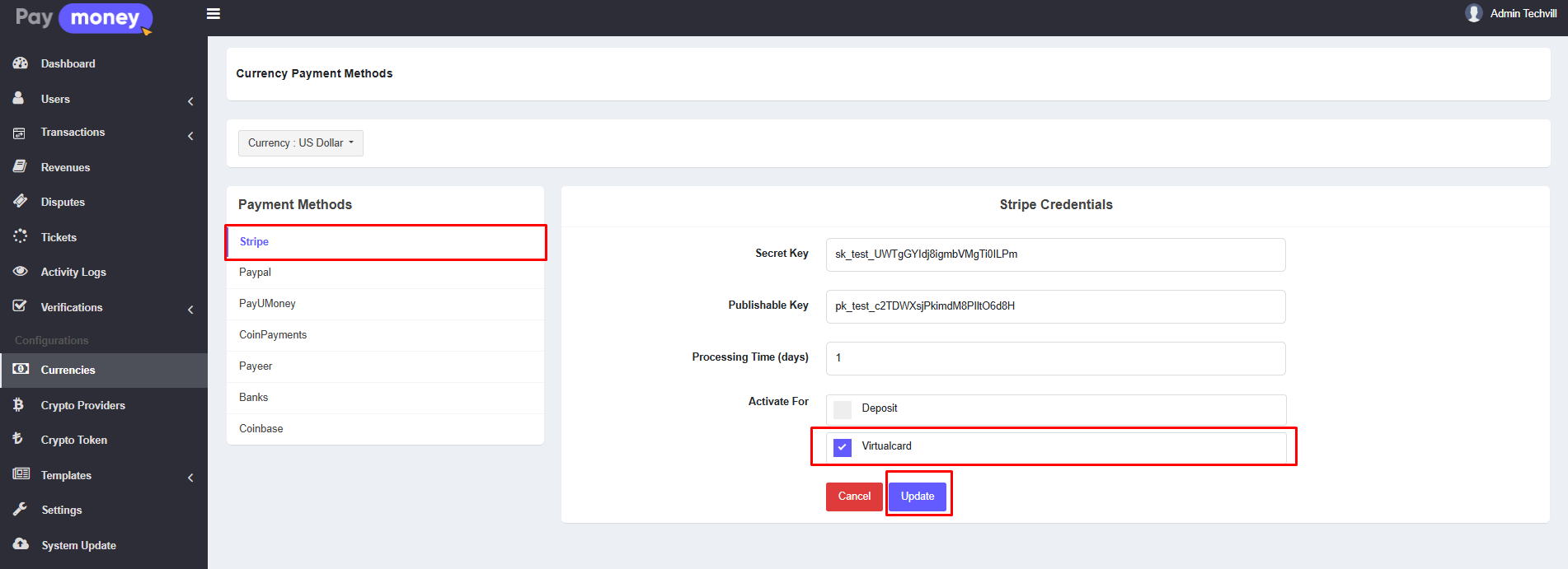 Here, check the Virtualcard option under Activate For. Then click on update button.