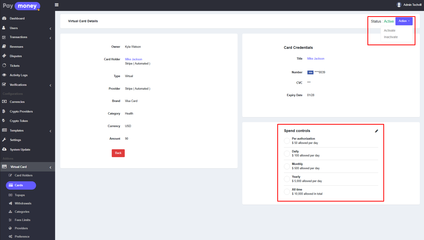 5. On the details page, after approval, the admin can set the spending control of a card. Additionally, the admin can active, inactive, or freeze the card from this page.