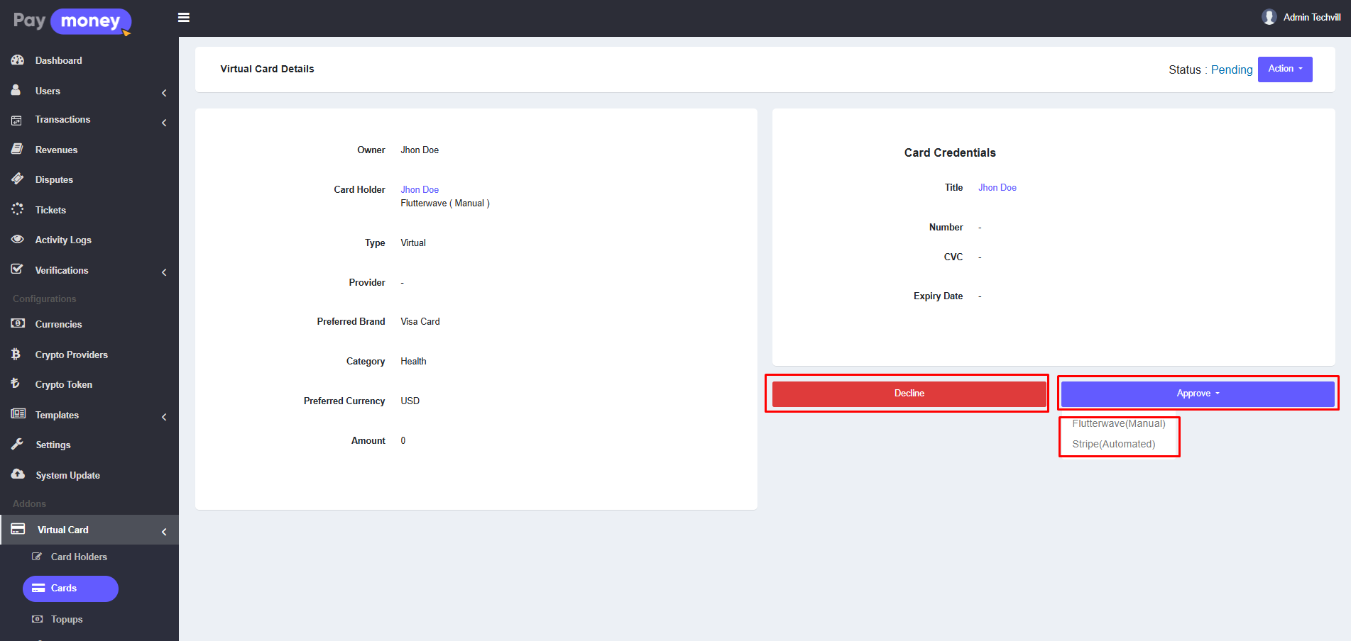 3. After clicking the eye icon, the admin can view the details of the specific virtual card. If the card's status is Pending, the admin can either Approve or Reject the card. After clicking the Approve button, the admin can approve the card using either the Manual Provider or the Automated Provider via API.