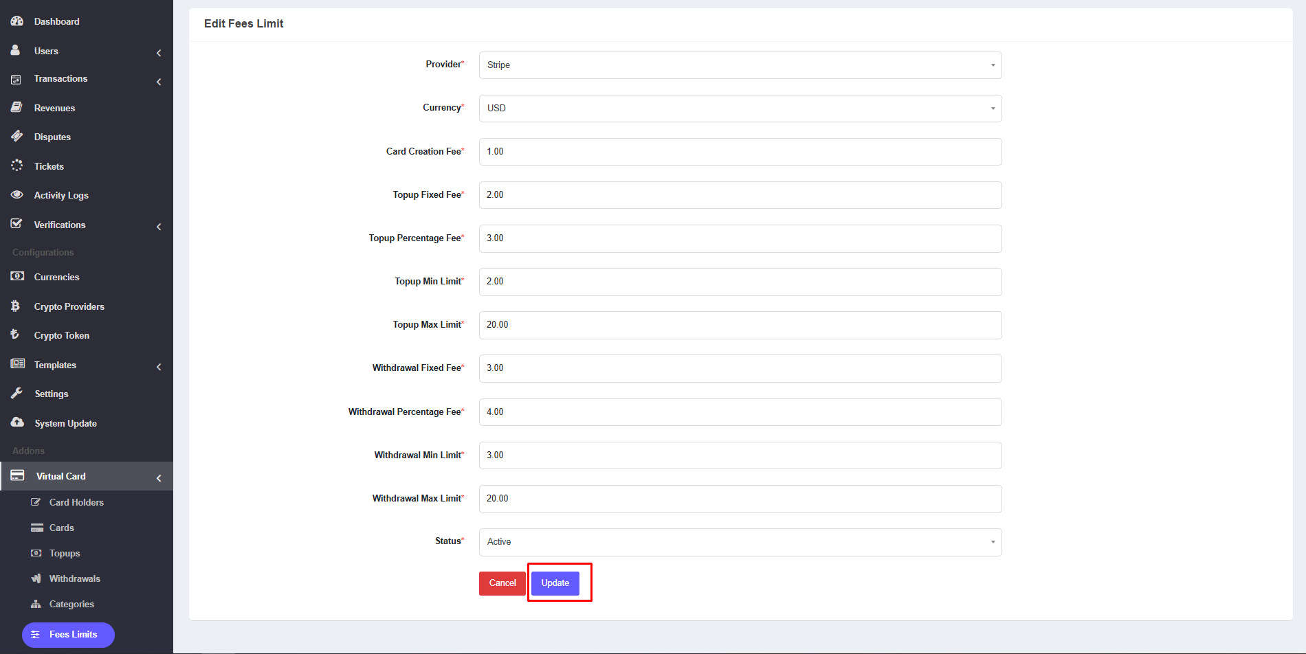1. The admin can view the list of fees limits from the admin panel. To access the list, navigate to Virtual Card >> Fees Limits. Here, the admin can see the list of all virtual card fees limits. By click on Add Fees Limit button admin can add new fees limit. In the list, each row includes an edit icon and an delete icon. Click the edit icon to edit the specific fees limit, or click the delete icon to delete a fees limit.