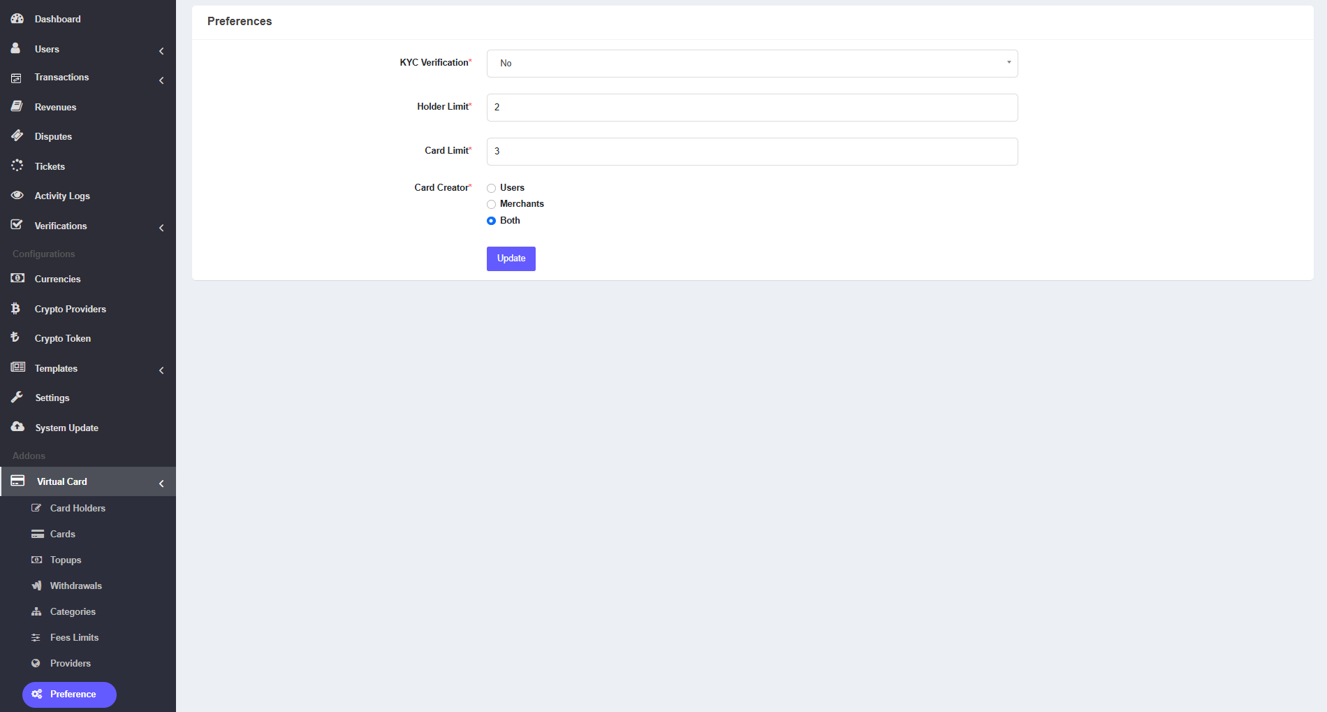 From this page admin can set some settings and restrictions for users. To access this menu please navigate Virtual Card >> Preferences.