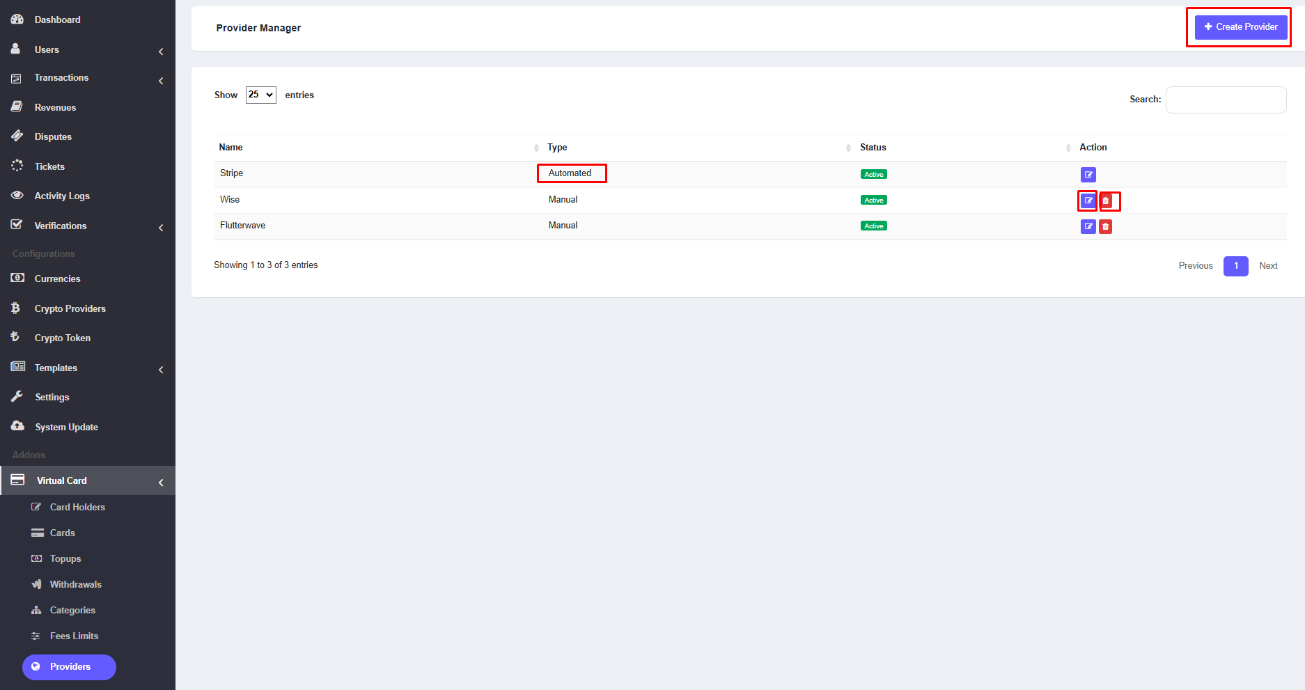 1. The admin can view the list of providers from the admin panel. To access the list, navigate to Virtual Card >> Providers. Here, the admin can see the list of all virtual card providers. By click on Create Provider button admin can add new provider. In the list, each row includes an edit icon and an delete icon. Click the edit icon to edit the specific provider, or click the delete icon to delete a provider. Here, Automated provider will be displayed when admin uploads a new automatic provider addon for virtual card.