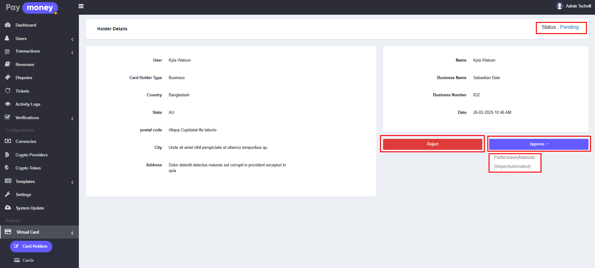 2. After clicking the eye icon, the admin can view the details of the specific virtual card holder. If the holder's status is Pending, the admin can either Approve or Reject the holder application. After clicking the Approve button, the admin can approve the card holder using either the Manual Provider or the Automated Provider via API. The providers are displayed from the available providers list on Virtual Card >> Providers.