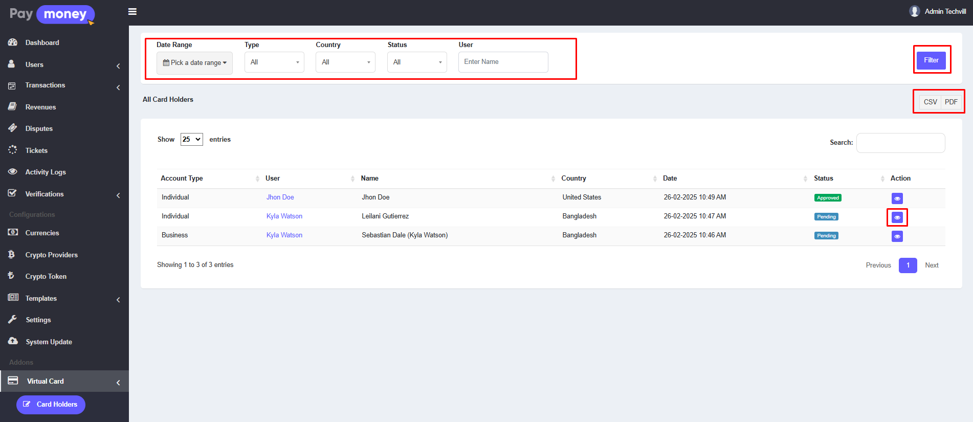 1. The admin can view the list of virtual card holders from the admin panel. To access the list, navigate to Virtual Card >> Card Holders. Here, the admin can see card holders submitted by different users. The list can be filtered using various options, including Date Range, Type, Country, Status and User. Additionally, the holder list data can be downloaded in CSV or PDF format. Each card holder has an eye icon; clicking on it displays the details of the specific virtual card holder.
