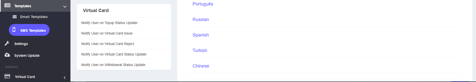 To locate the virtual card email and SMS templates in the admin panel, navigate to Templates >> Email Templates or Templates >> SMS Templates. Scroll down to the Virtual Card section to find the relevant templates.