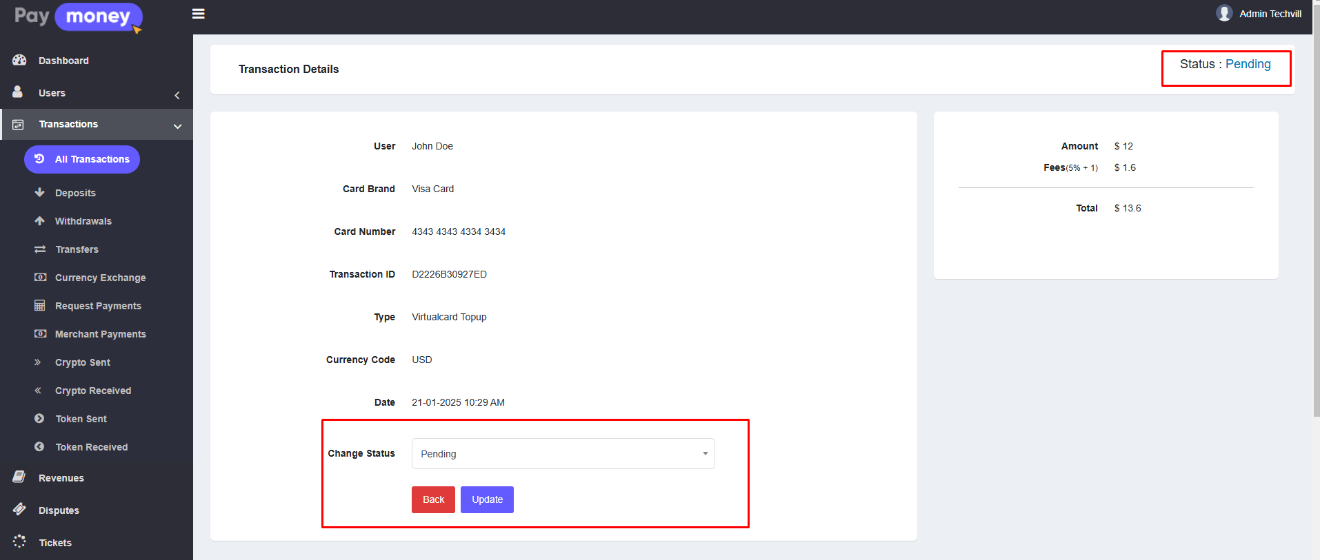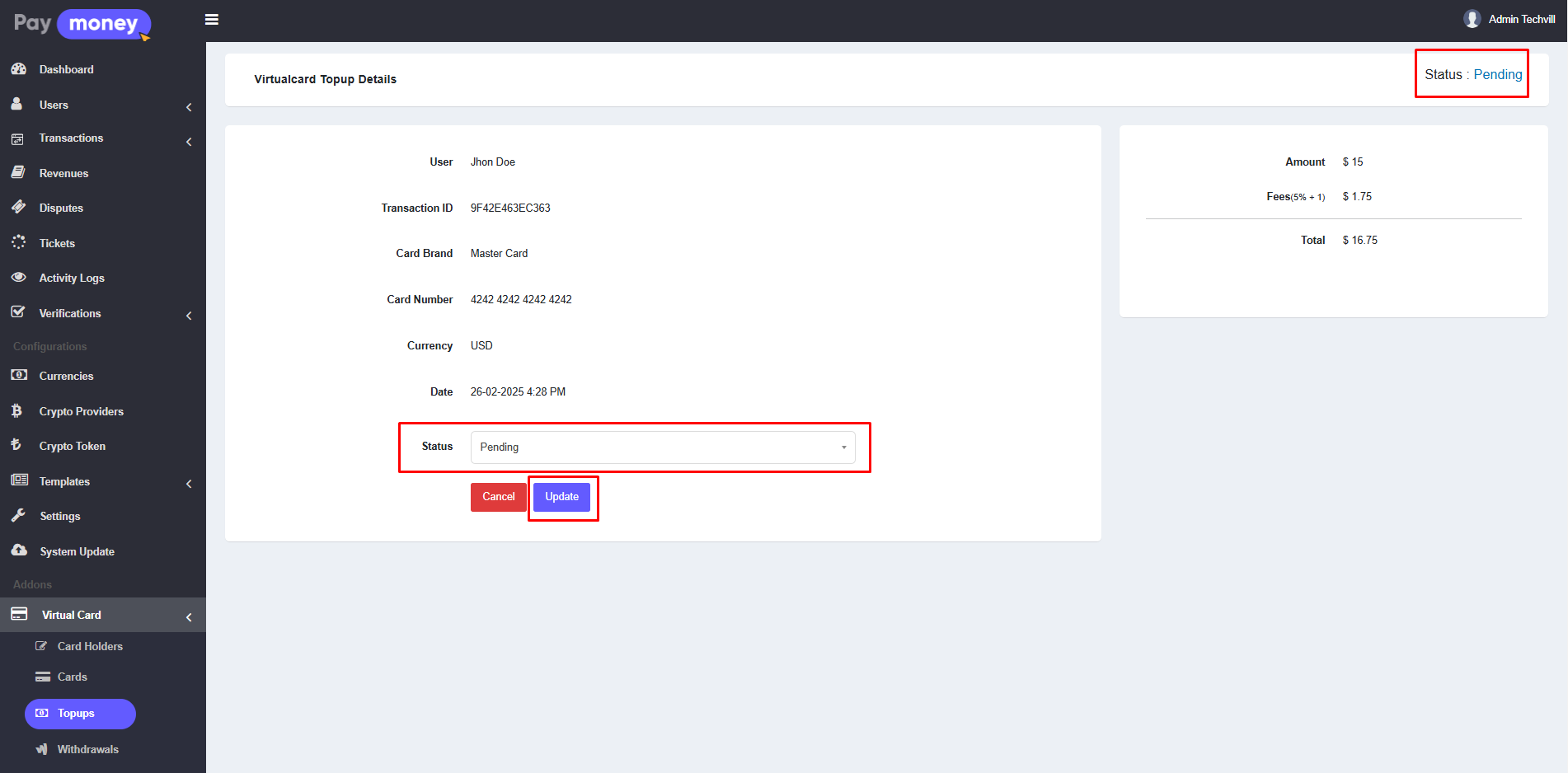 2. After clicking the eye icon, the admin can view the details of the specific topup. If the topup's status is not Approved, the admin has the option to change its status.