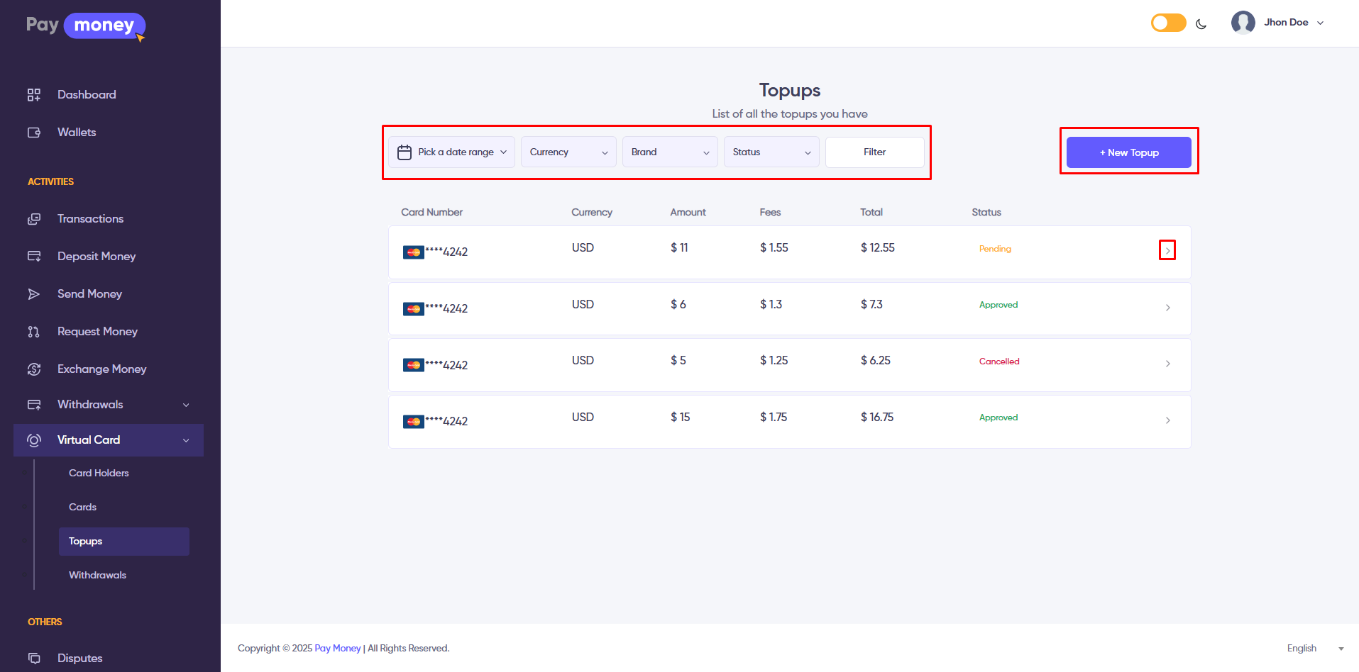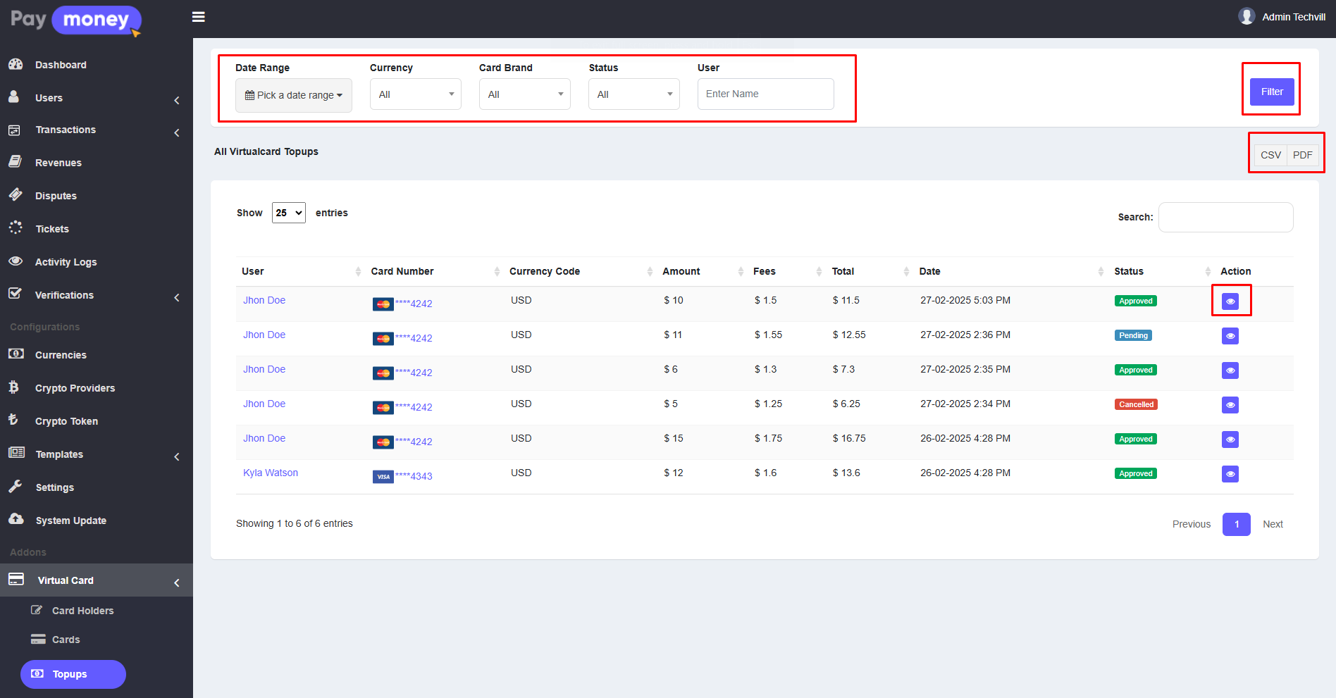 1. The admin can view the list of topups from the admin panel. To access the list, navigate to Virtual Card >> Topups. Here, the admin can see the topups made by different users. The list can be filtered using options such as Date Range, Card Brand, Currency, Status, and User. Additionally, the topup list can be downloaded in CSV or PDF format. Each row includes an eye icon; click the eye icon to view the details of a specific topup.
