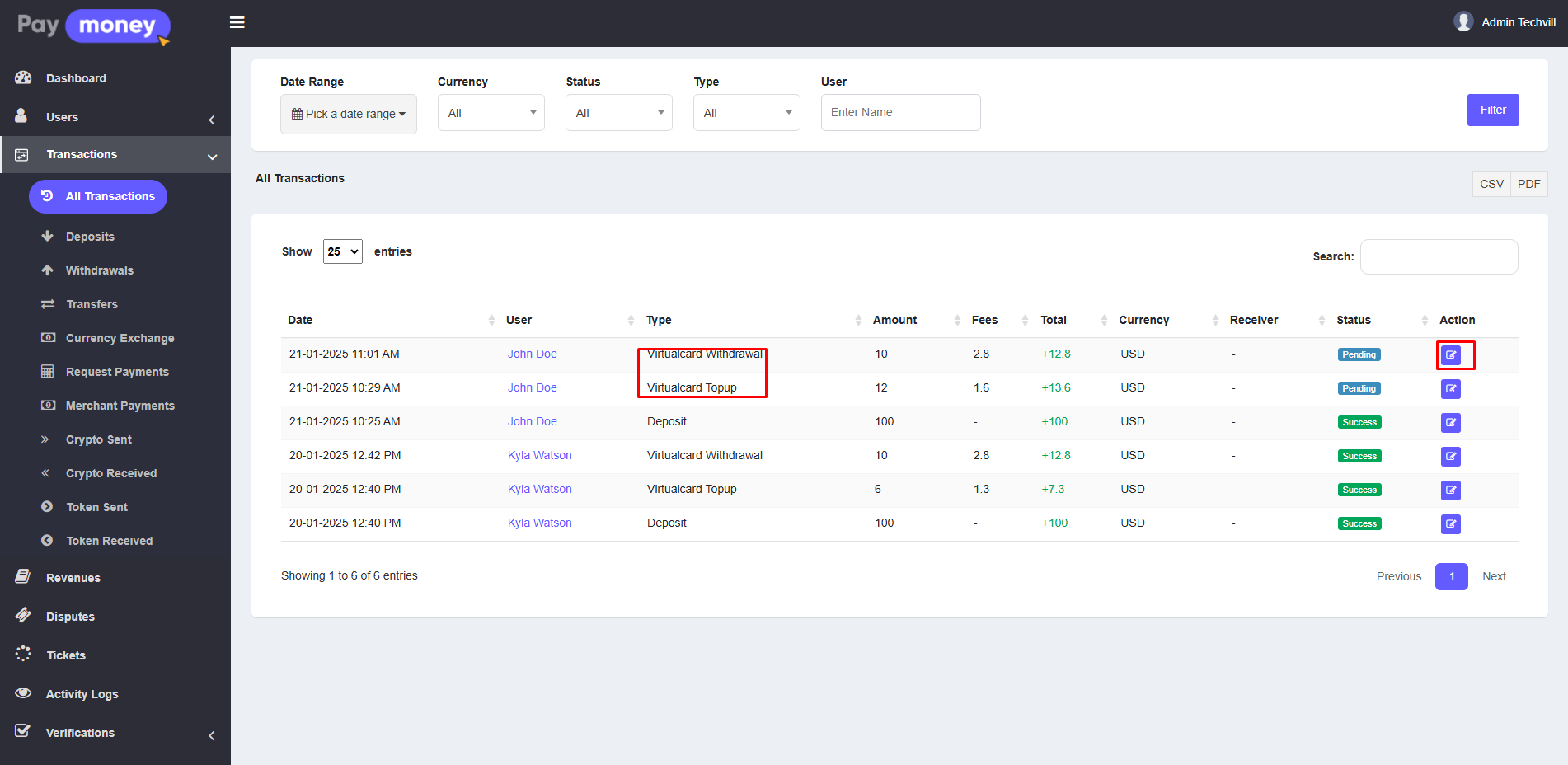 1. Virtual card transactions are part of the core transactions section, where admins can view and manage them alongside other transaction types. Virtual card transactions can be identified by their transaction types: Virtualcard Withdrawal and Virtualcard Topup. Each transaction row includes an edit icon; click it to view the details of a specific withdrawal or topup.