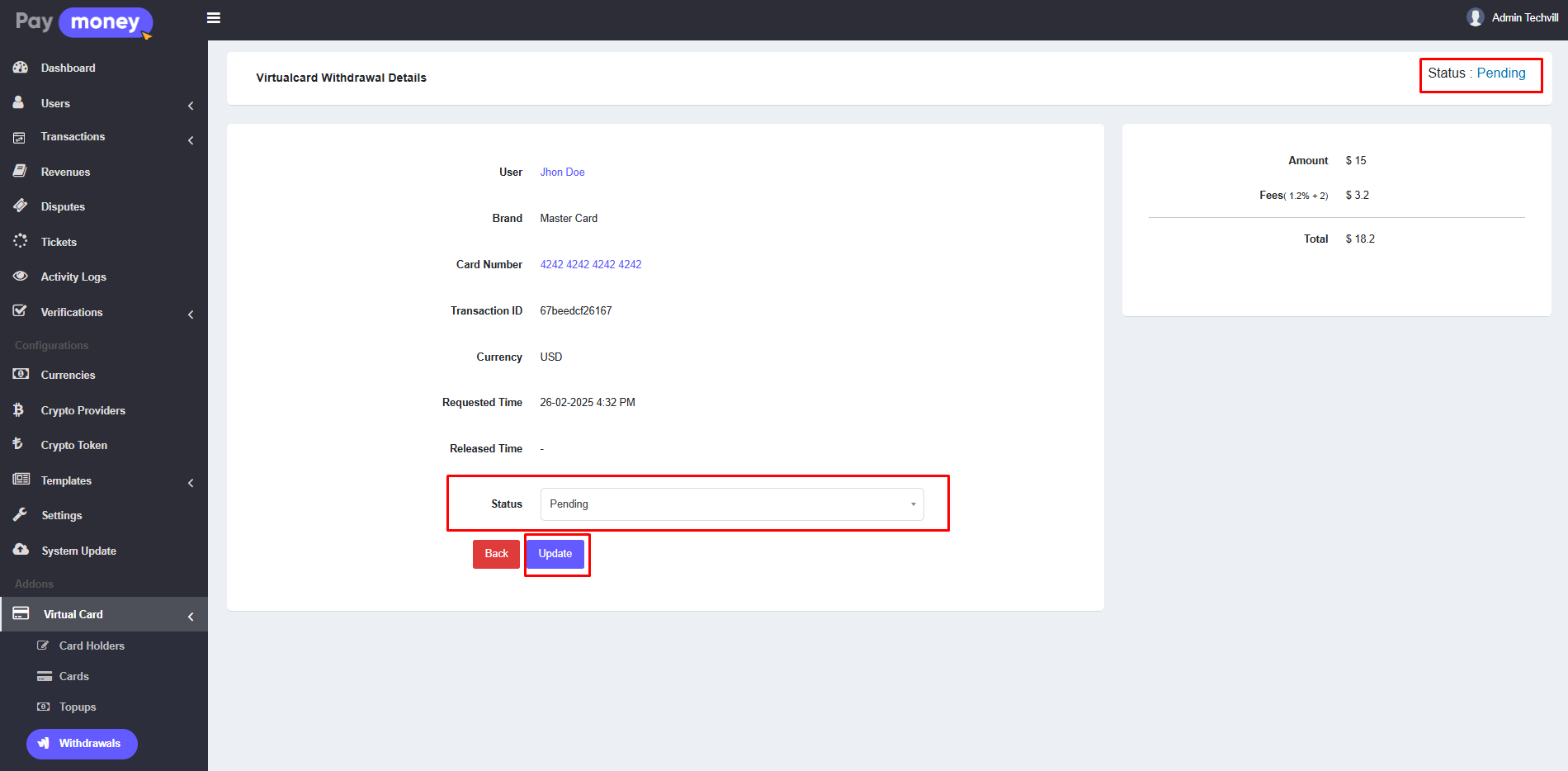 If the card is manual, the withdrawal status will be Pending. The admin must manually approve the withdrawal to complete the transaction.