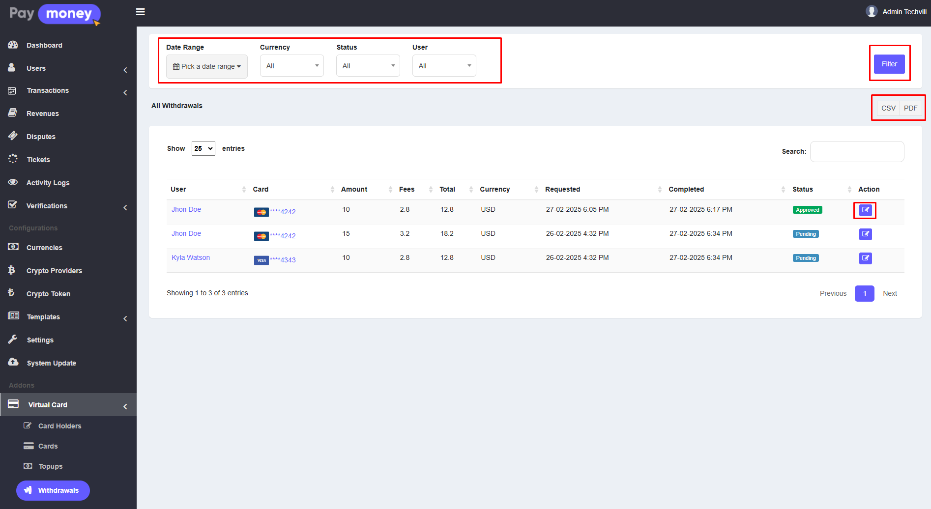 1. The admin can view the list of withdrawals from the admin panel. To access the list, navigate to Virtual Card >> Withdrawals. Here, the admin can see the withdrawals made by different users. The list can be filtered using options such as Date Range, Currency, Status, and User. Additionally, the withdrawal list can be downloaded in CSV or PDF format. Each row includes an edit icon; click the edit icon to edit the details of a specific withdrawal.