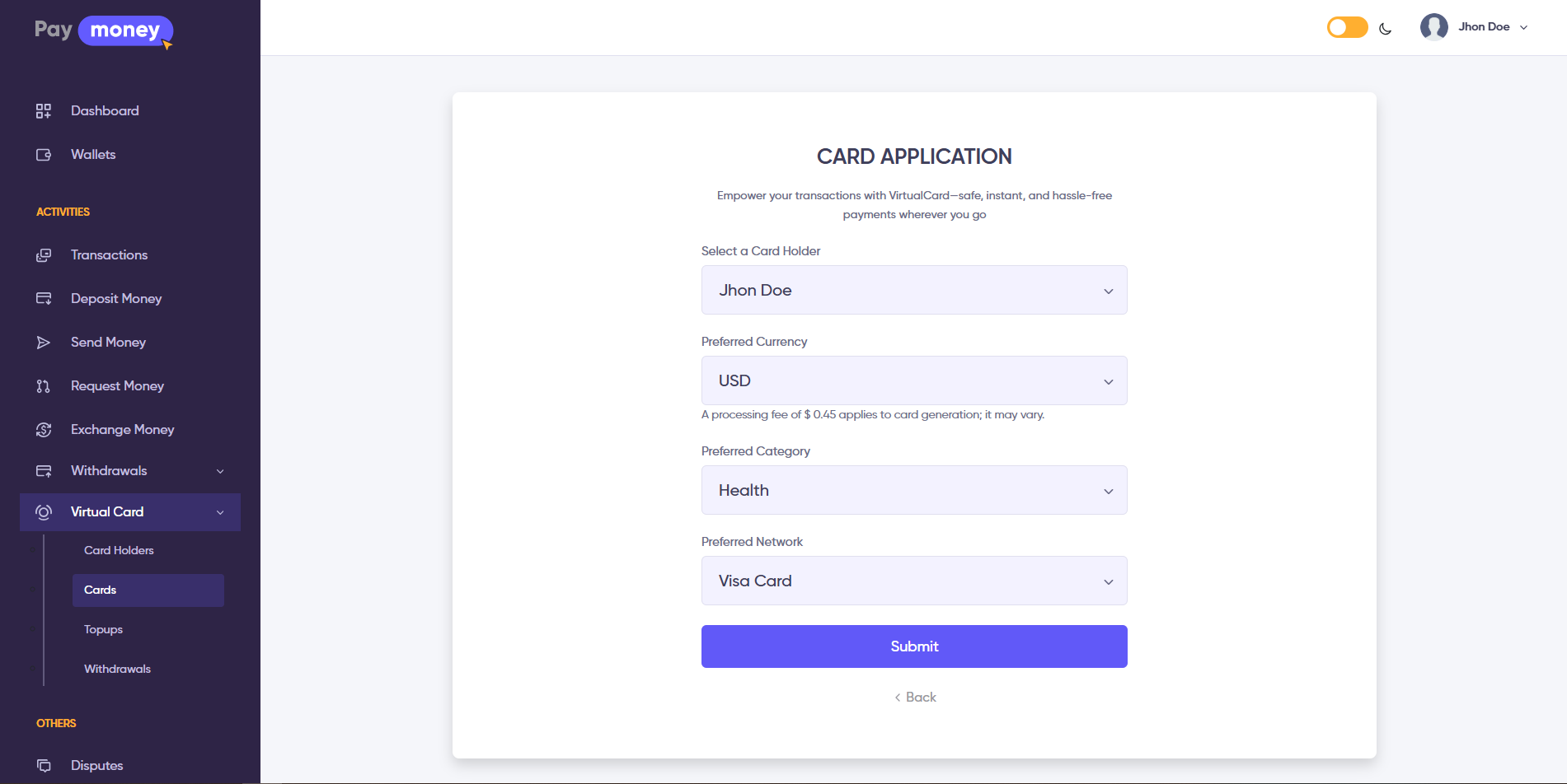 3. After clicking the New Card button, the user will be redirected to the Card Create page. Here, users can create their own virtual card.