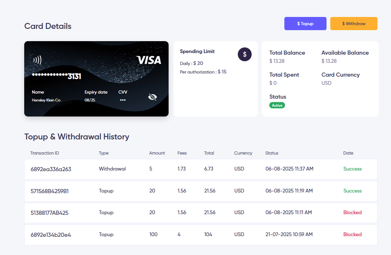 2. After clicking the arrow icon icon the user can view the details of the card. By clicking the Topup or Withdrawal button, they can directly initiate a Topup or Withdrawal using this specific virtual card. Additionally, users can view the transaction history of both Topups and Withdrawals from this page.