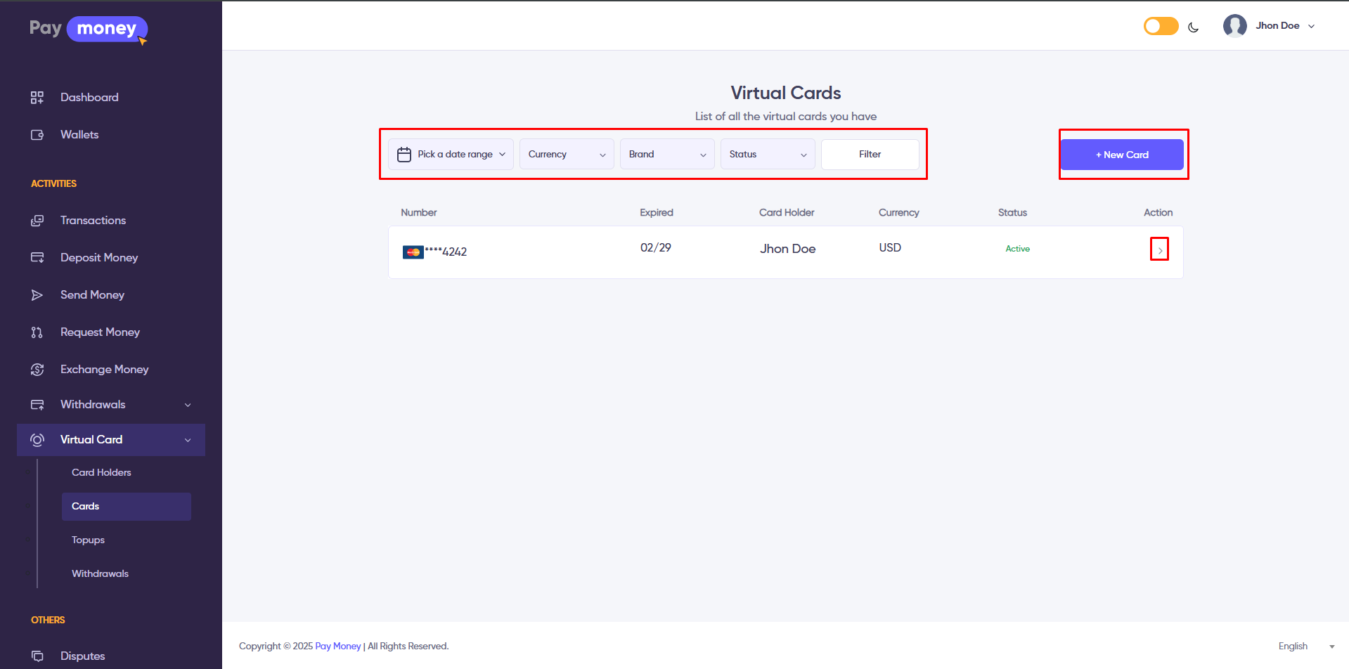 1. The user's can view their own list of virtual card from user panel. To access the list, navigate to Virtual Card >> Cards. The list can be filtered using various options, including Date Range, Currency, Brand and Status. Each card in the list has an arrow icon; clicking on it displays the details of the specific virtual card. Additionally, by clicking the New Card button, the user can request a new virtual card.