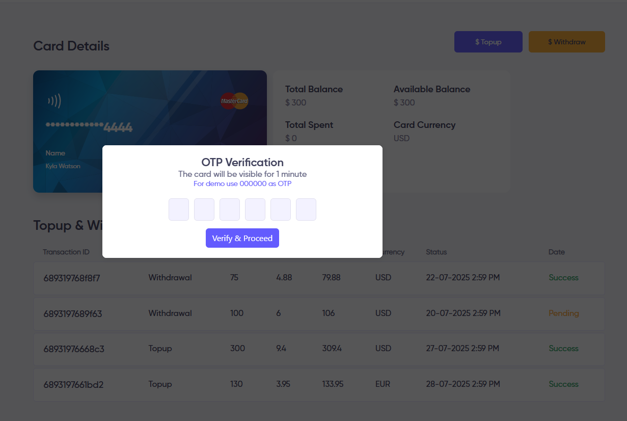 To view the card number, click on the eye icon on the card body. A verification code will be sent to the user's registered email. The user must then enter this code in the OTP Verification form. Once verified, the card details will be visible for a limited time.