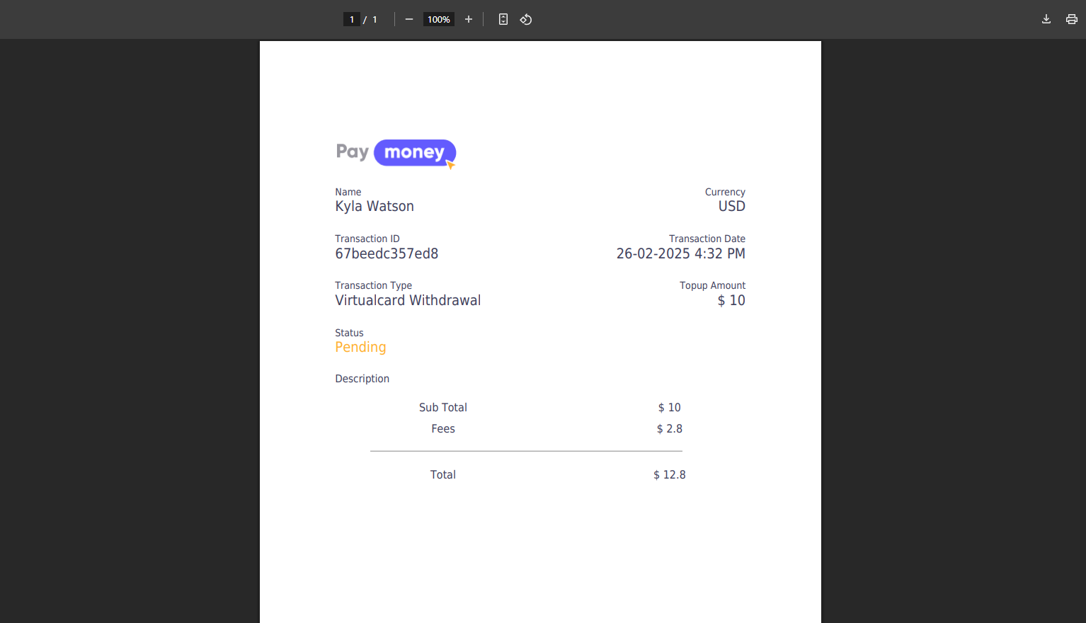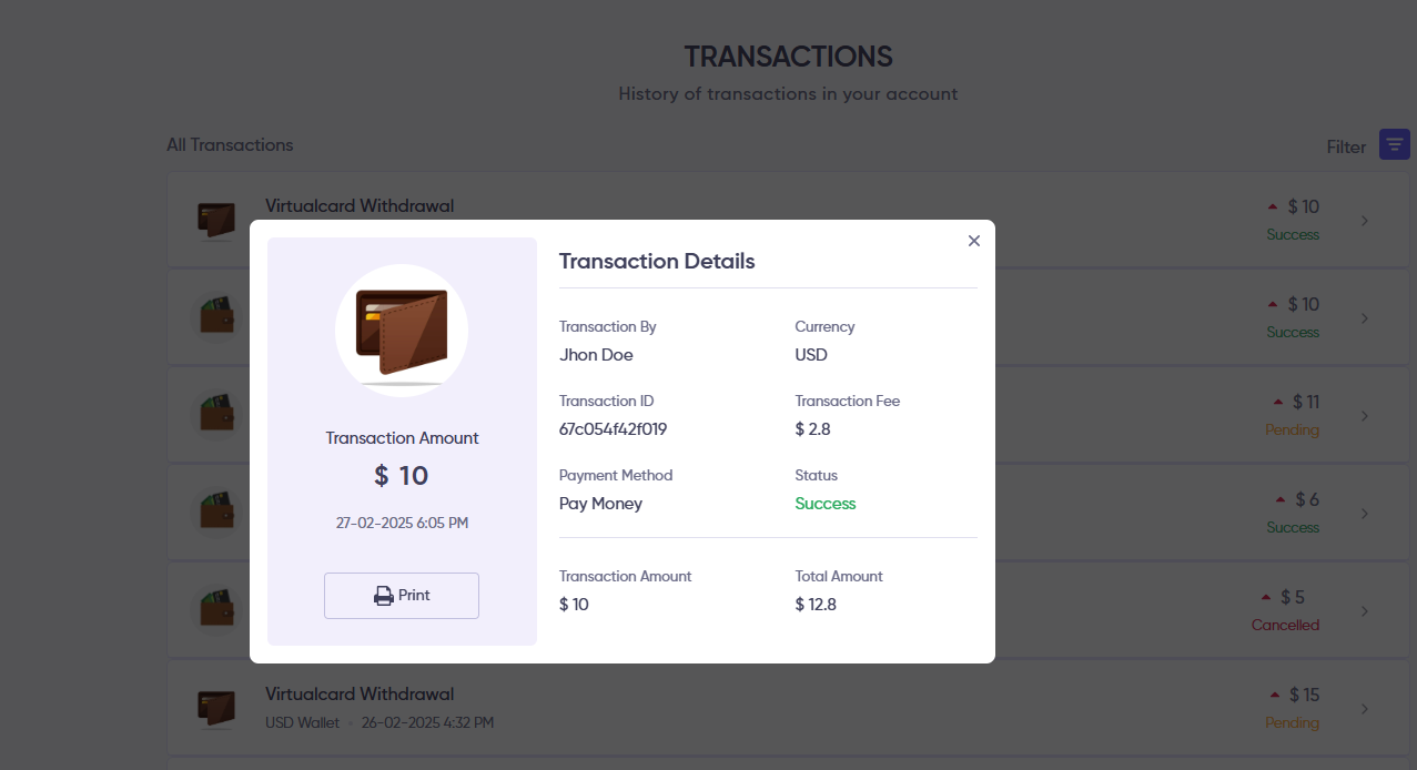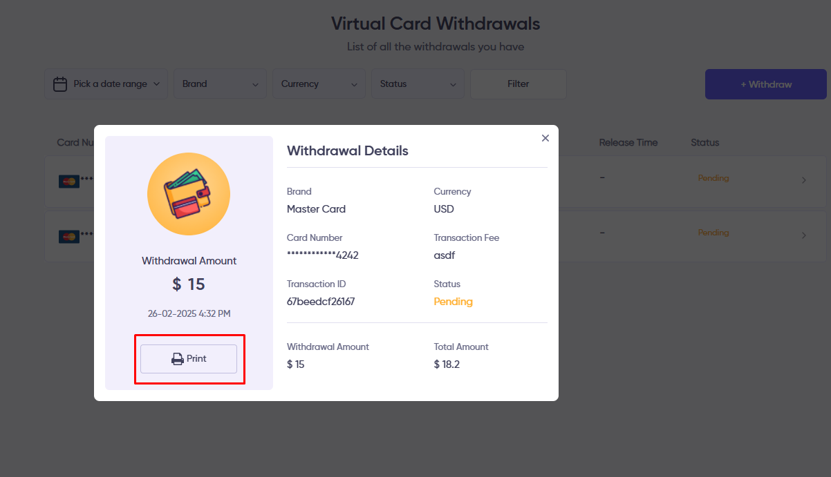 5. After clicking the arrow icon icon from the list, user can view the details of the Withdrawal. By clicking the Print button, they can print the invoce of that withdrawal.