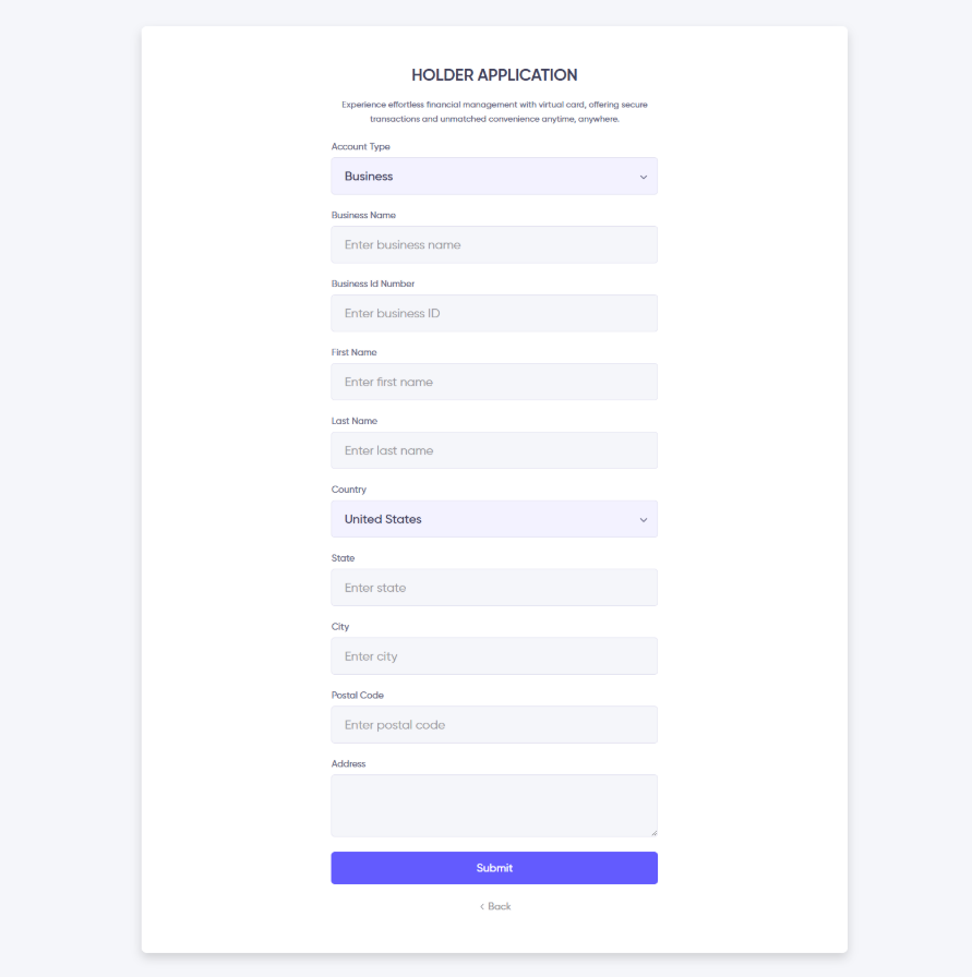 3. After clicking the Apply Now button, the user will be redirected to the Holder Create page. Here, users can create their own virtual card holder. They can choose between two types of card holders: Individual and Business, based on their preference.