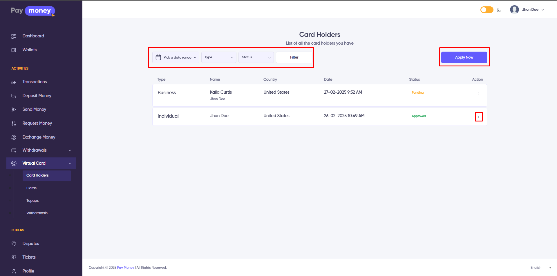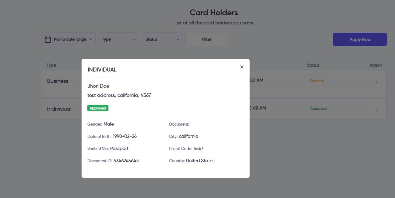 1. The user's can view their own list of virtual card holders from user panel. To access the list, navigate to Virtual Card >> Card Holders. The list can be filtered using various options, including Date Range, Type and Status. Each card holder in the list has an arrow icon; clicking on it displays the details of the specific virtual card holder. Additionally, by clicking the Apply Now button, the user can request a new virtual card holder.