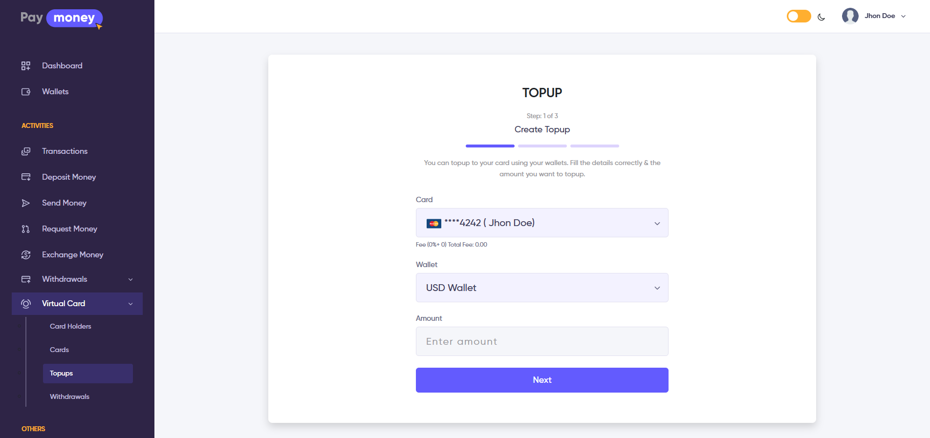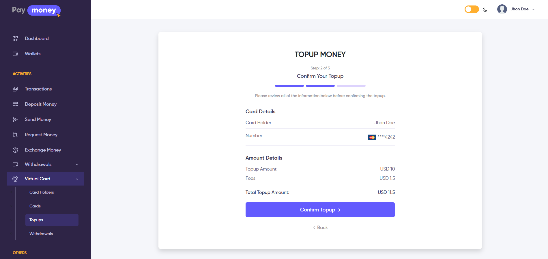 To initiate the topup, the user must have enough balance in the selected wallet to transfer funds to the virtual card.