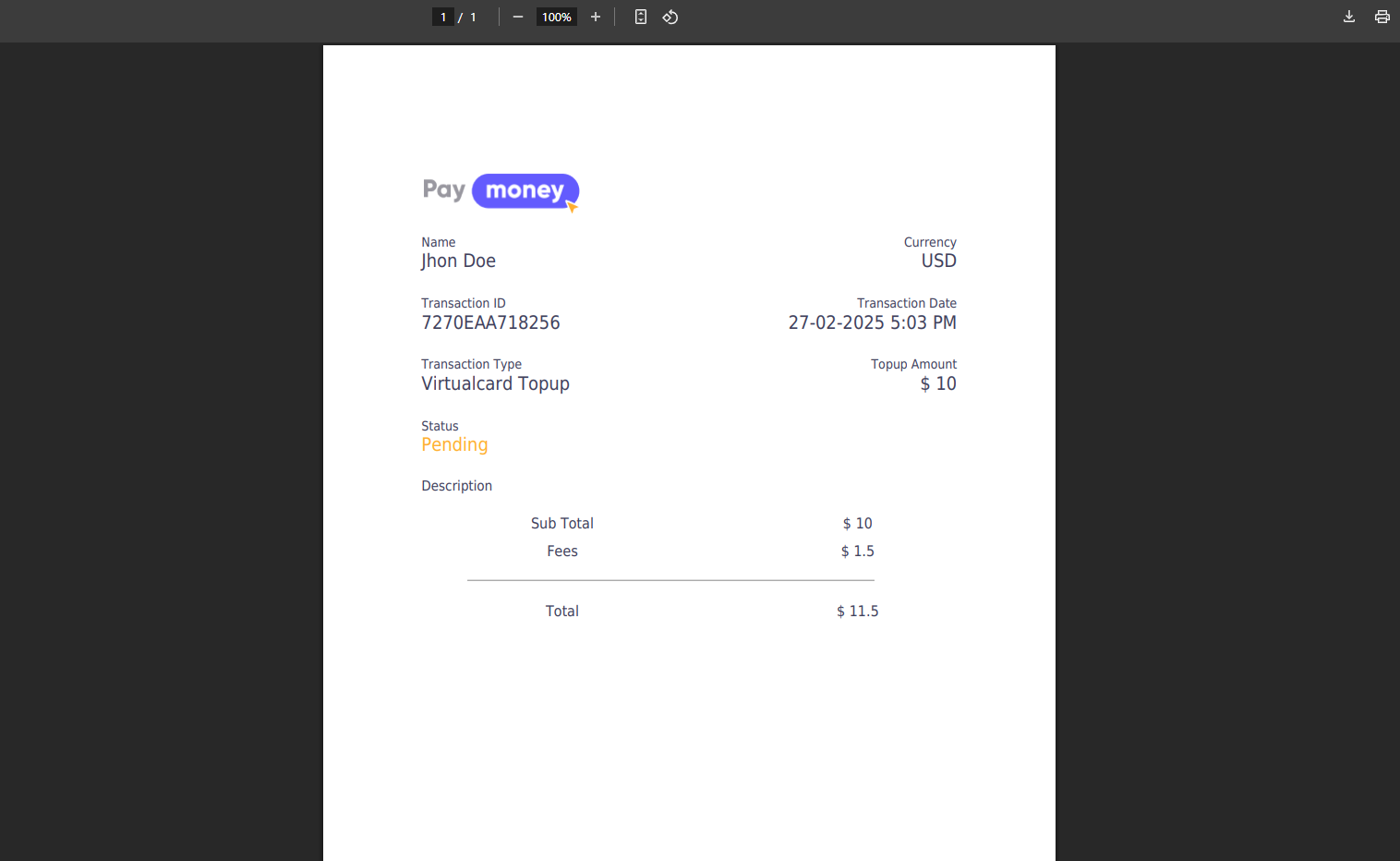 5. After clicking the arrow icon icon from the list, user can view the details of the Topup. By clicking the Print button, they can print the invoce of that topup.