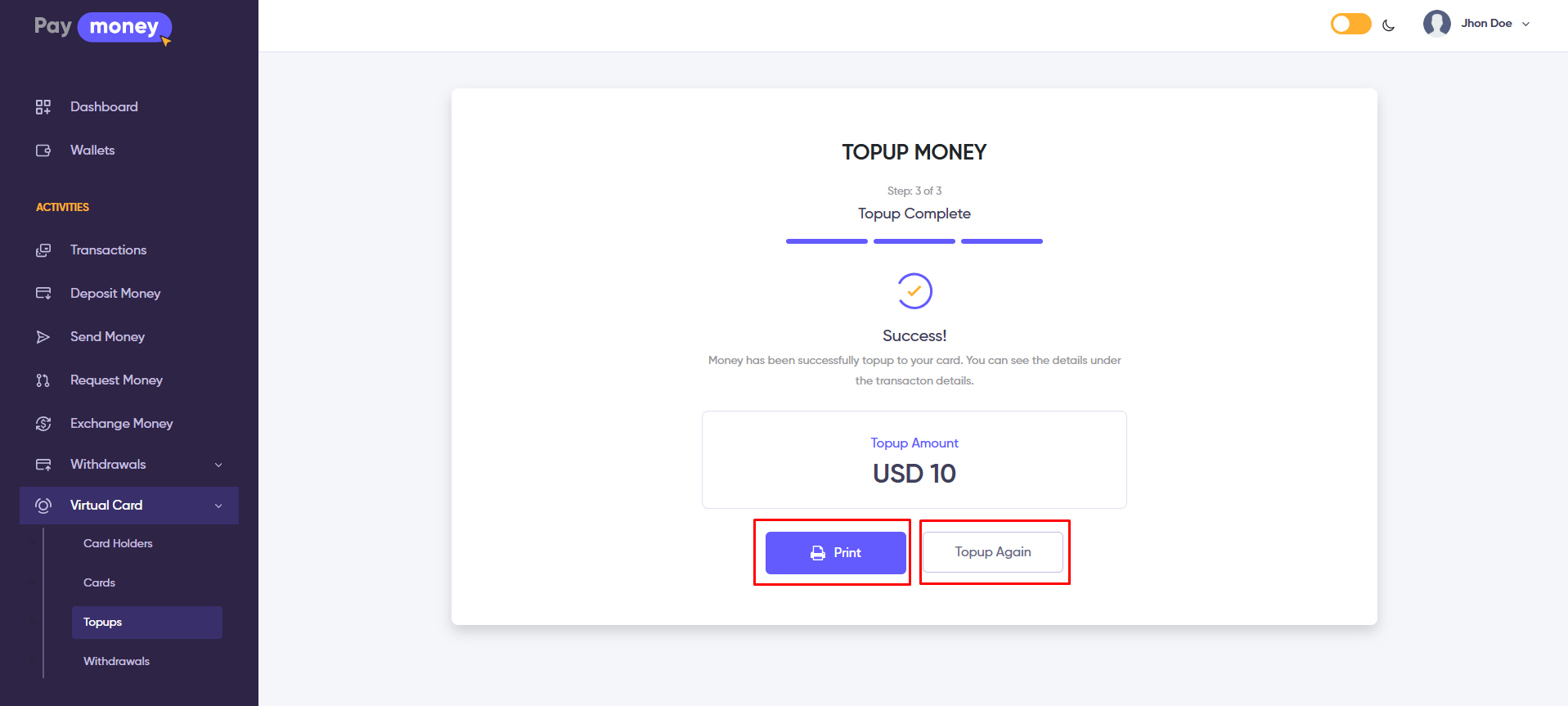 - Click the Topup Again button to initiate another topup.