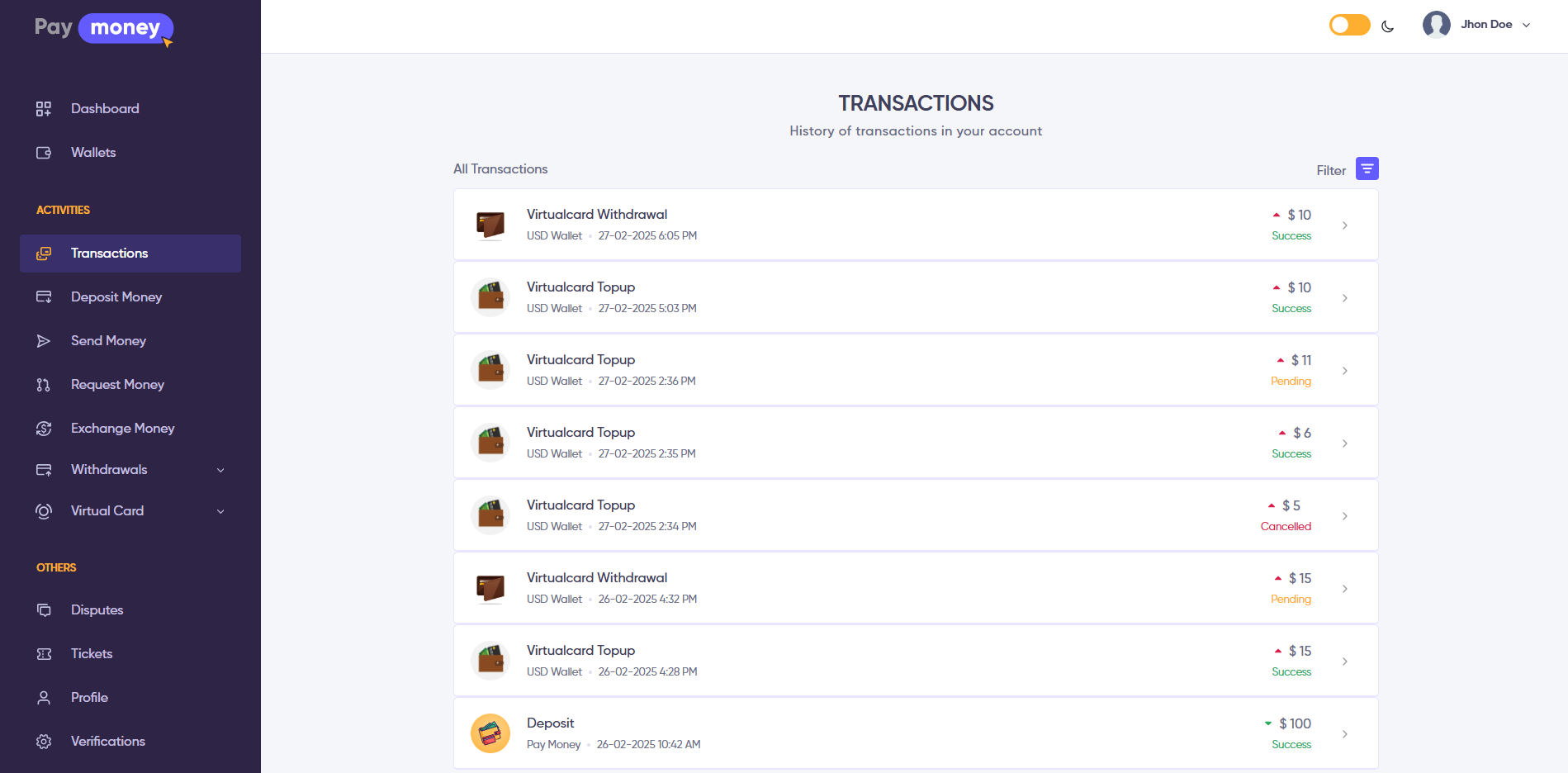 To view all topup and withdrawal transactions, navigate to Virtual Card >> Transactions. Here, users can see a complete list of topup and withdrawal transactions. Click on a specific transaction to view its details.