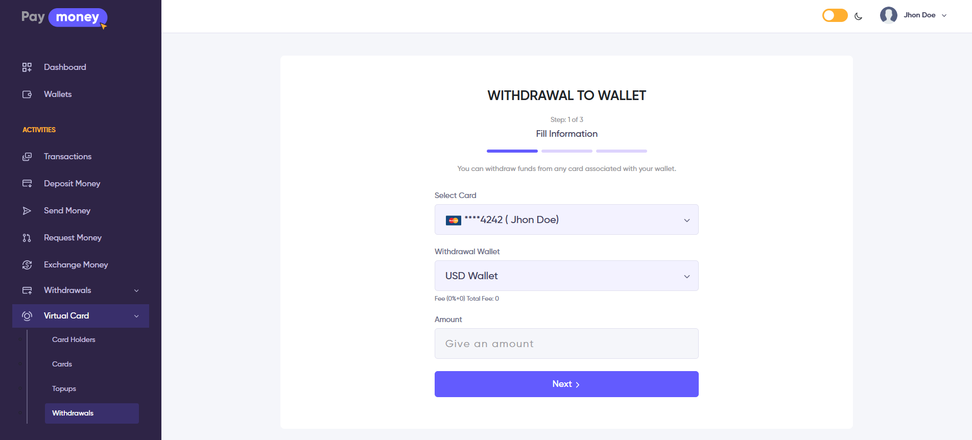 To initiate the withdrawal, the user must have enough balance in the selected virtual card to transfer funds to the wallet.