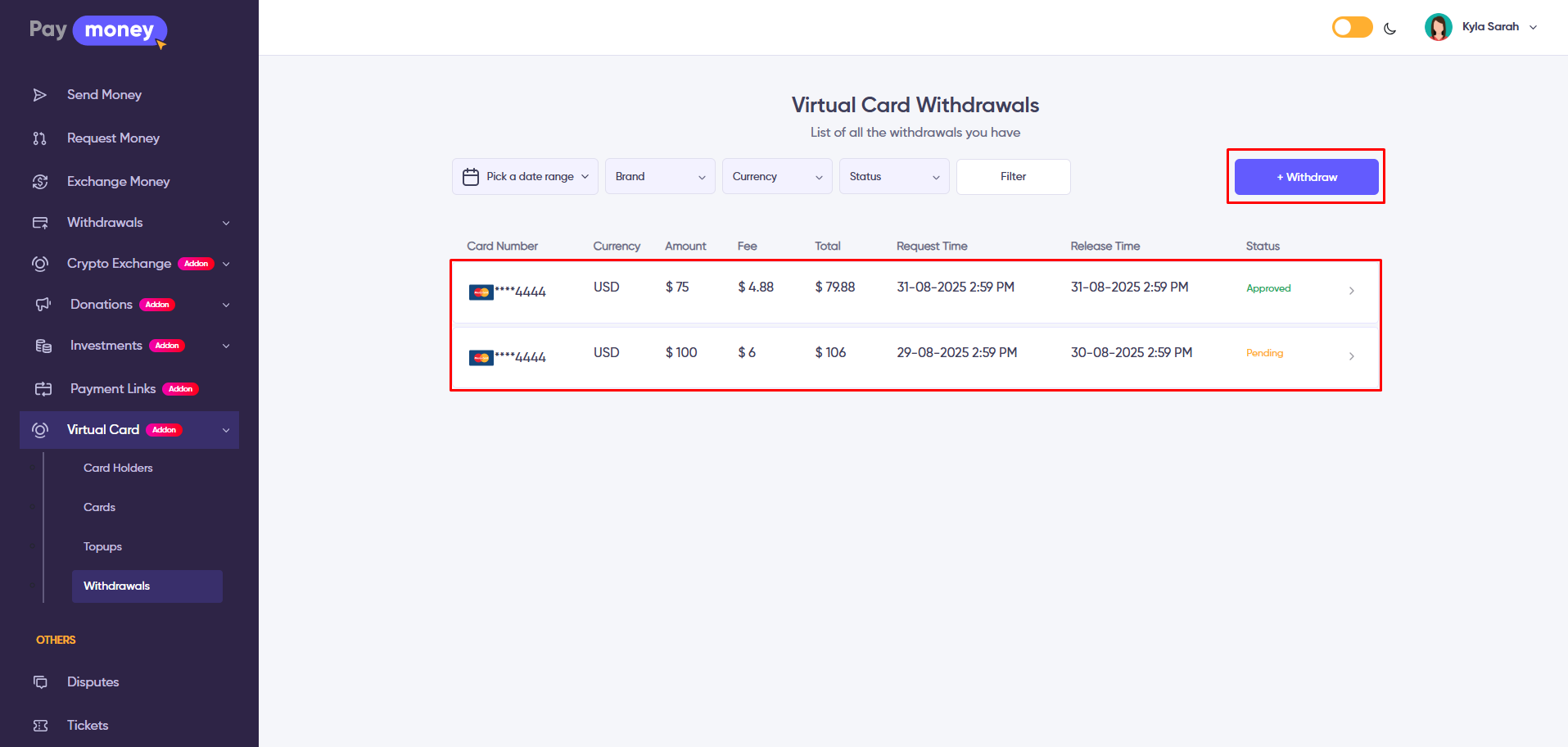 1. Here, users can view all withdrawals for their virtual cards. To access the list, navigate to Virtual Card >> Withdrawals.