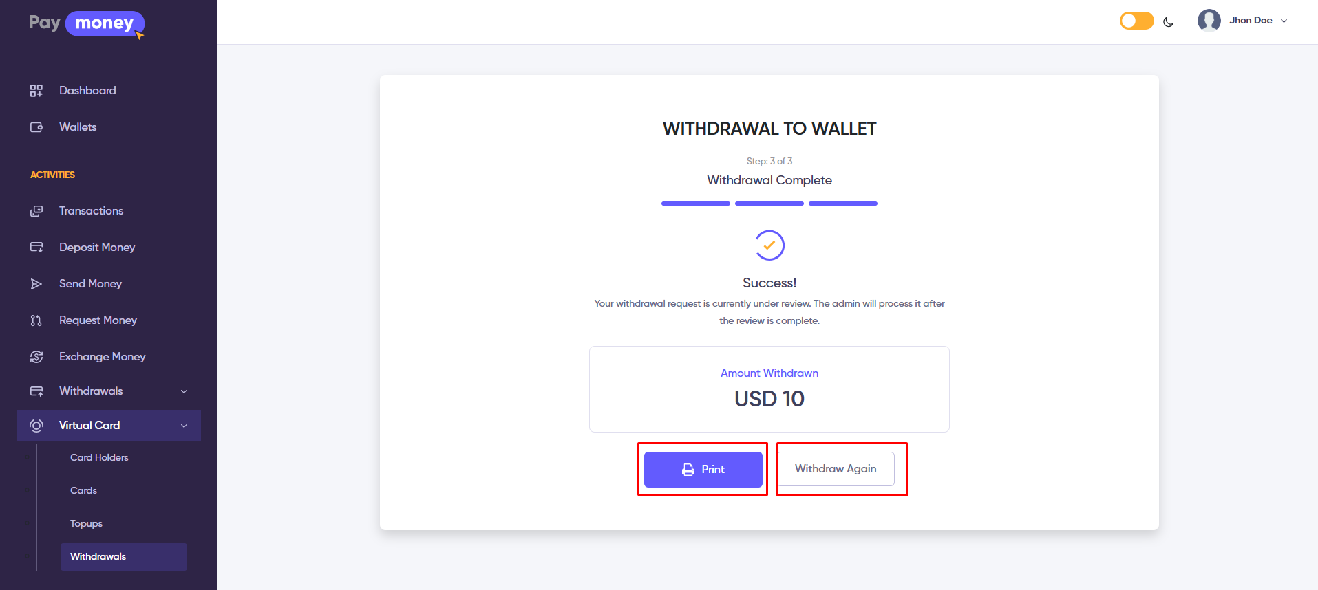 - Click the Withdrawal Again button to initiate another withdrawal.
